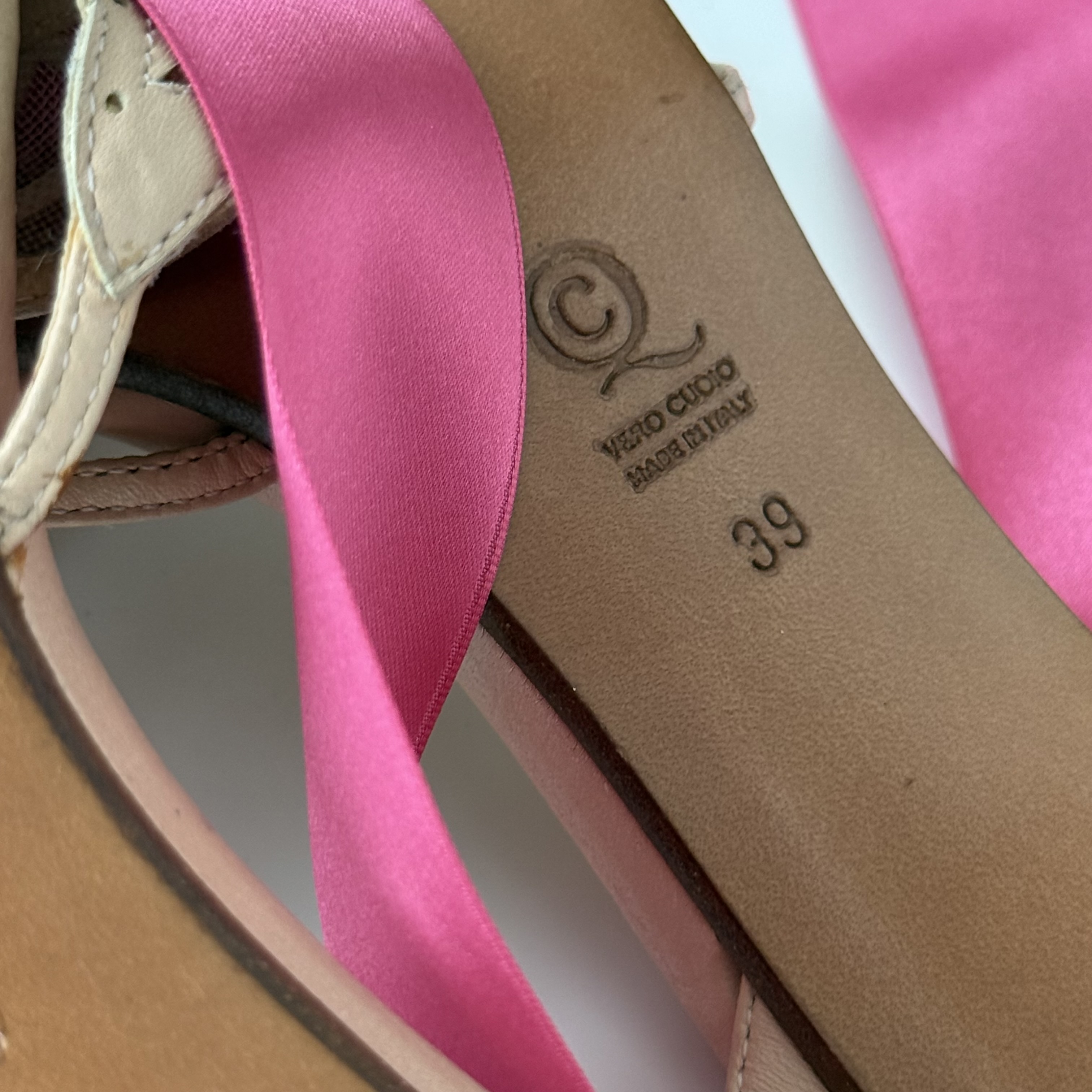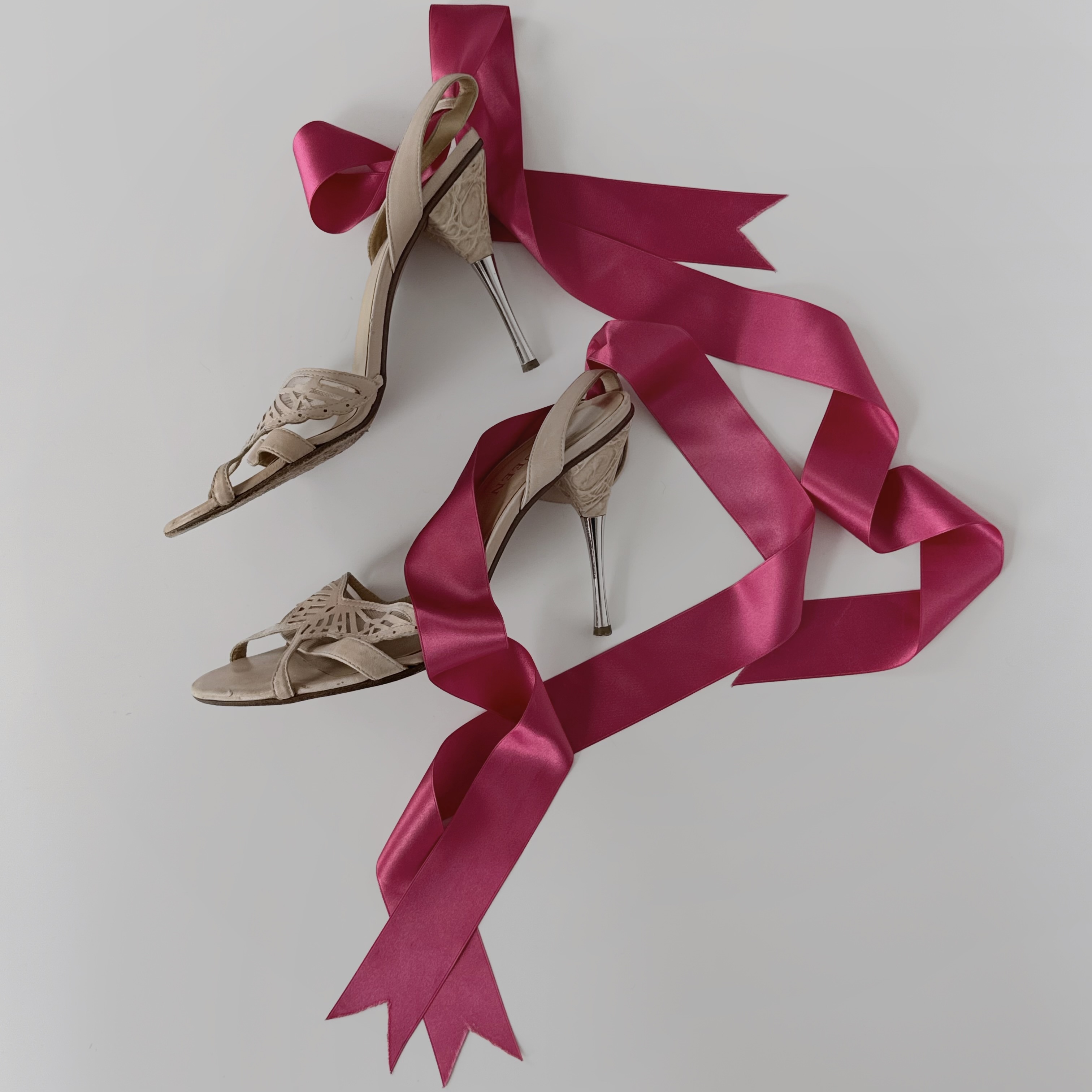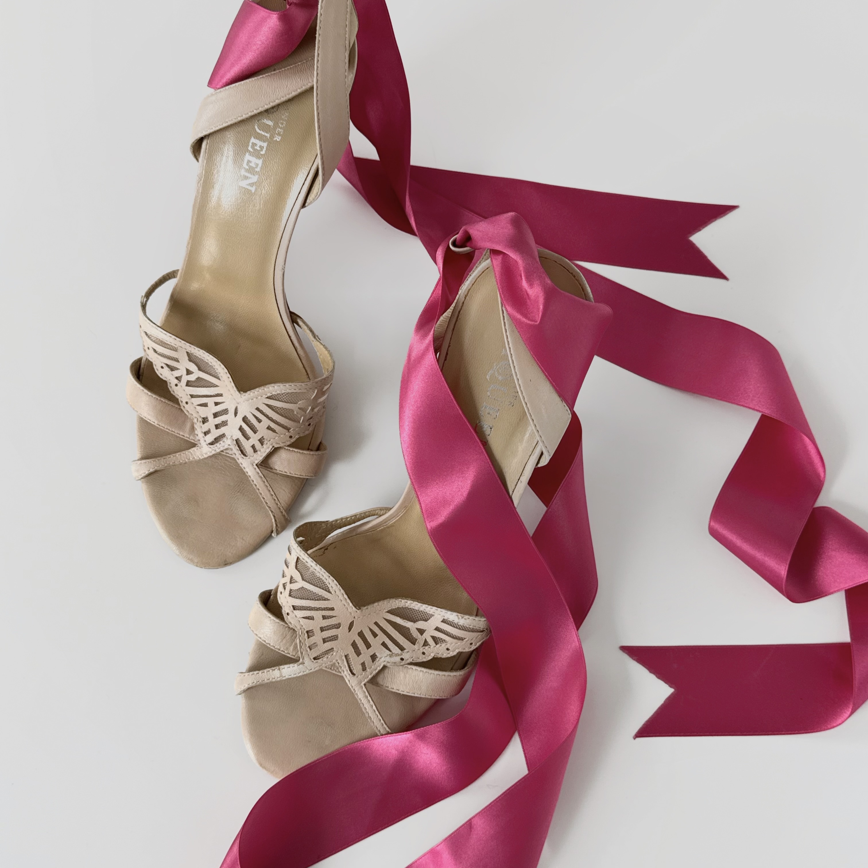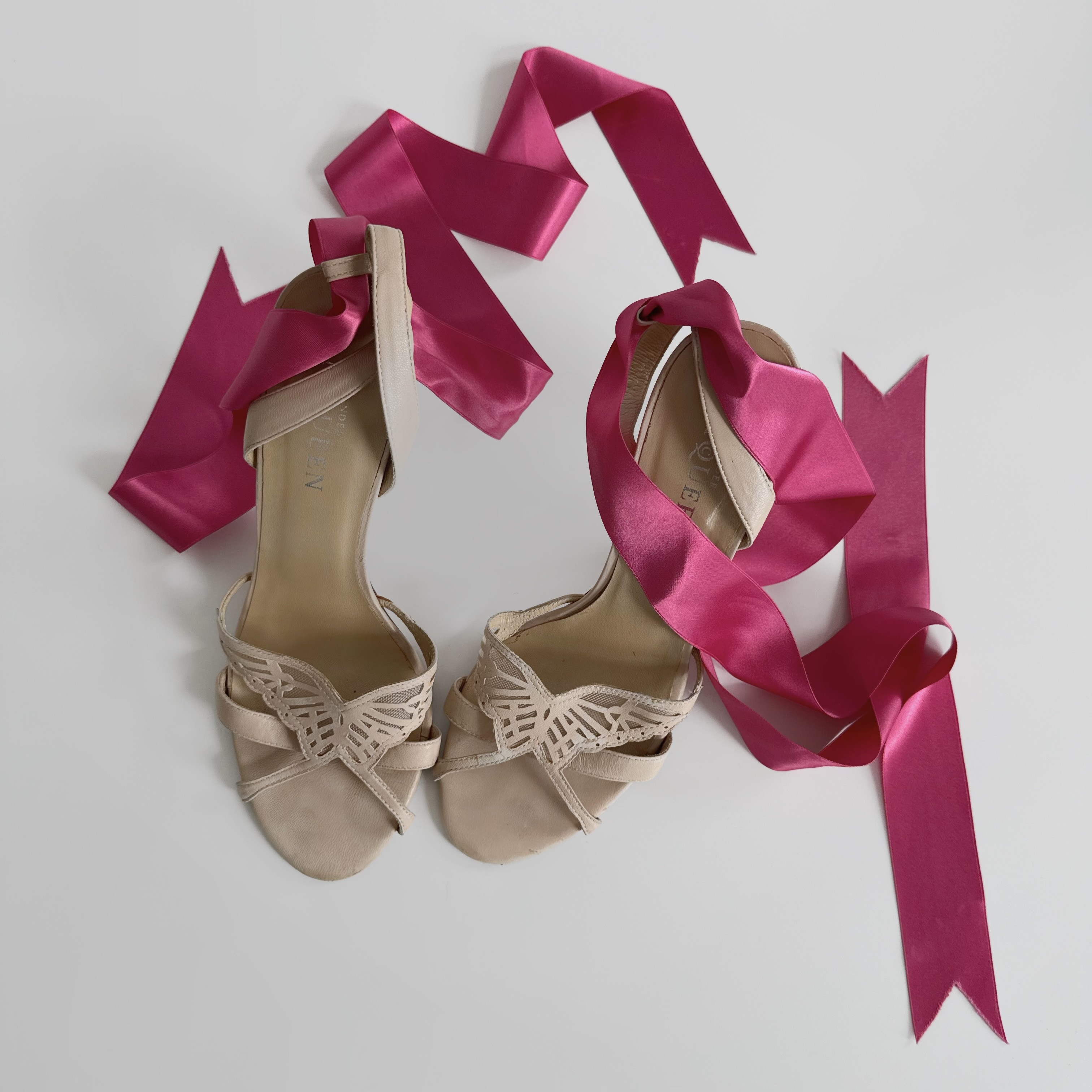 the most beautiful and romantic cream leather heels with butterfly elements in front. metallic silver heels and bright pink ribbons around the legs