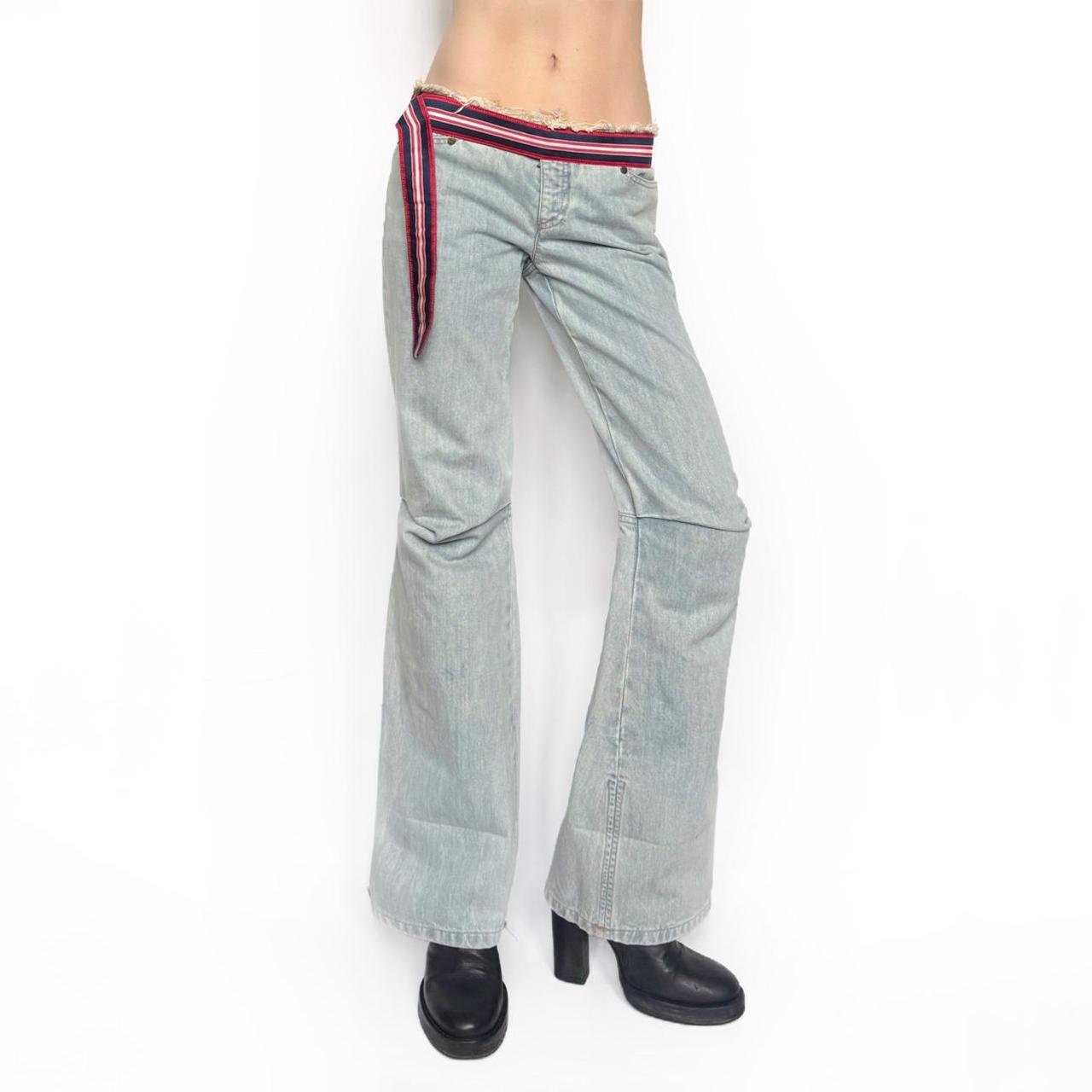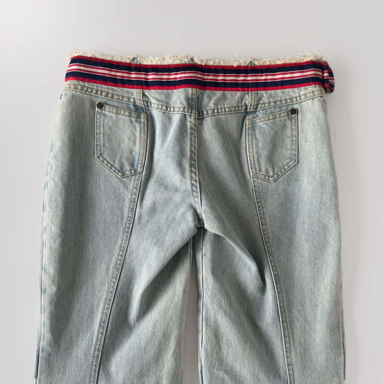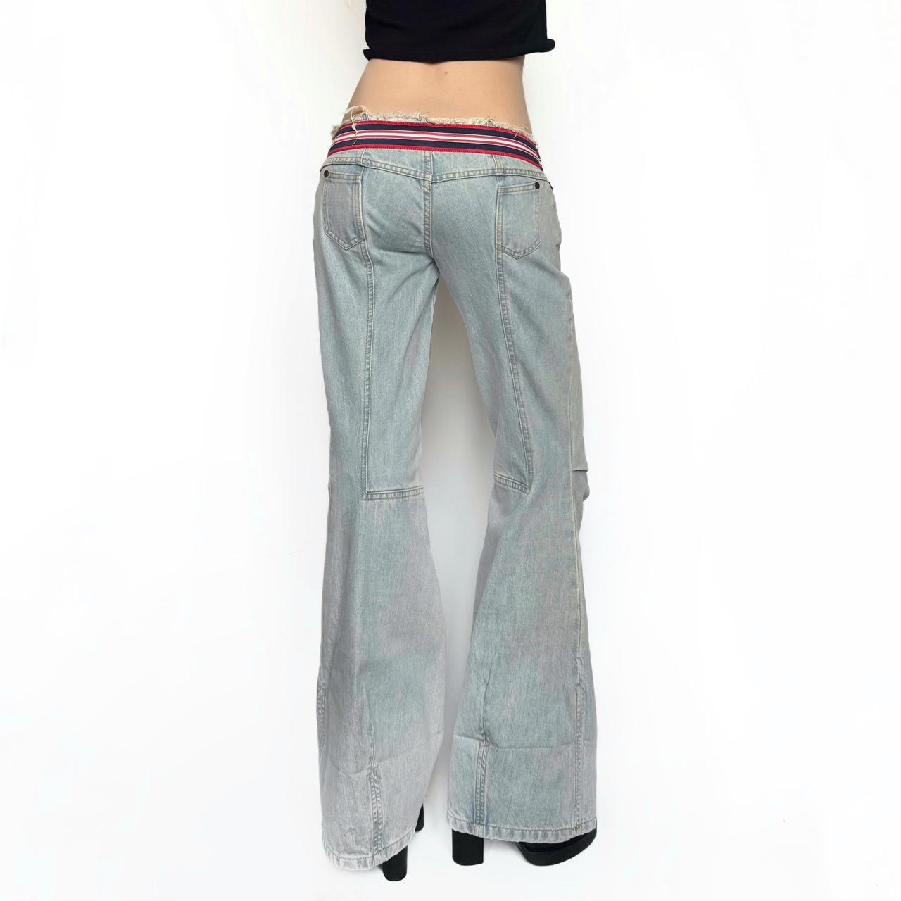 archive jeans in washed light blue colour. low-rise fit, raw edges and build in striped belt