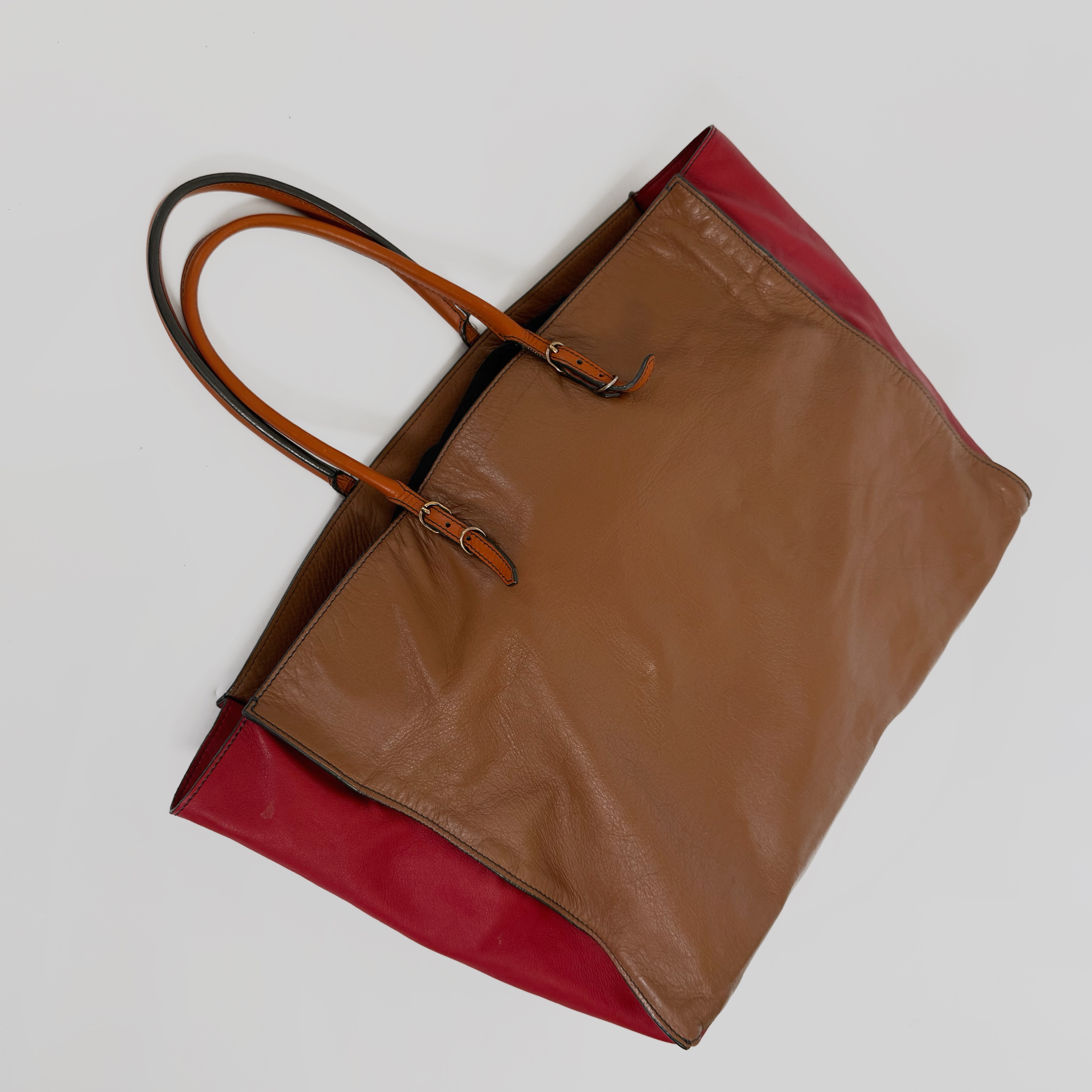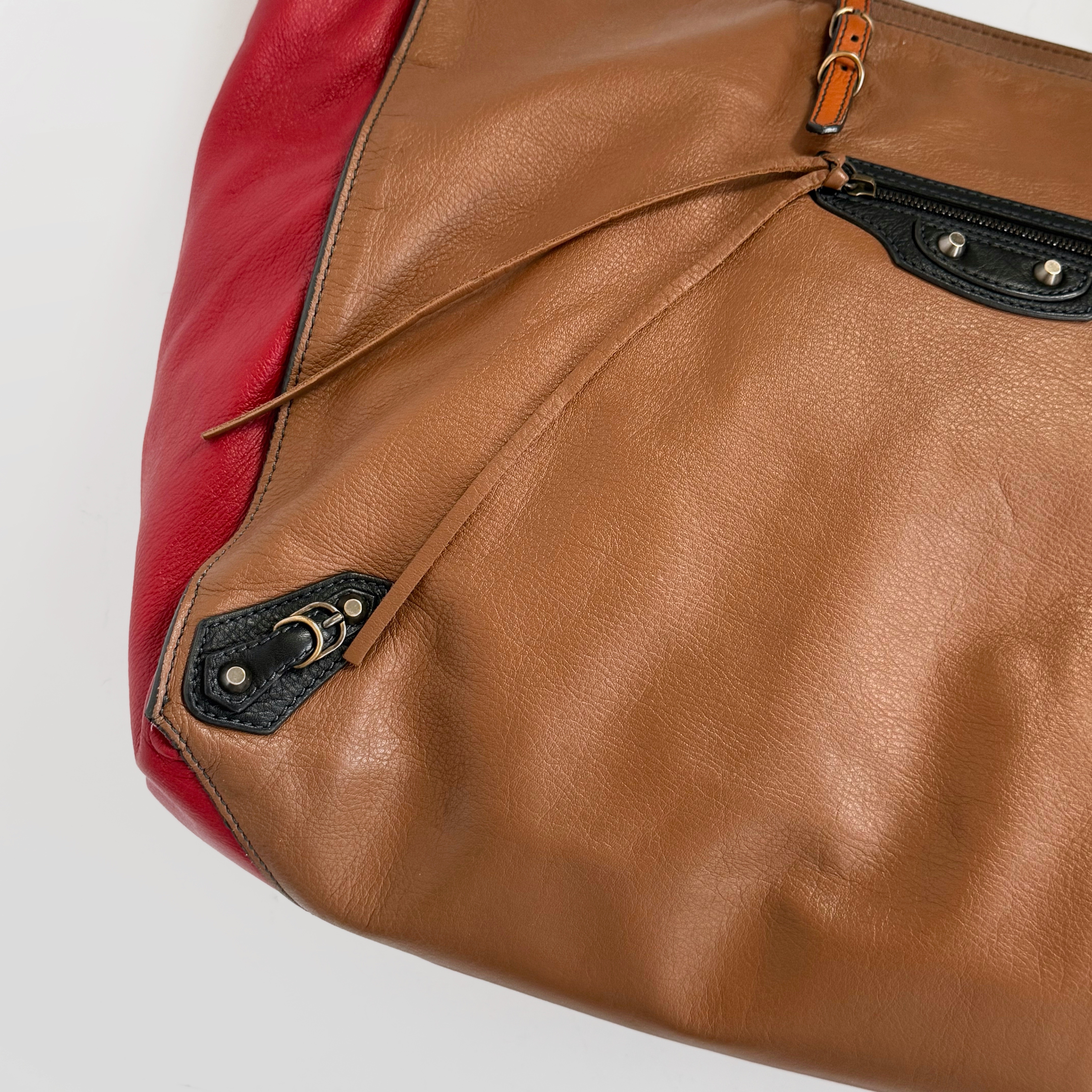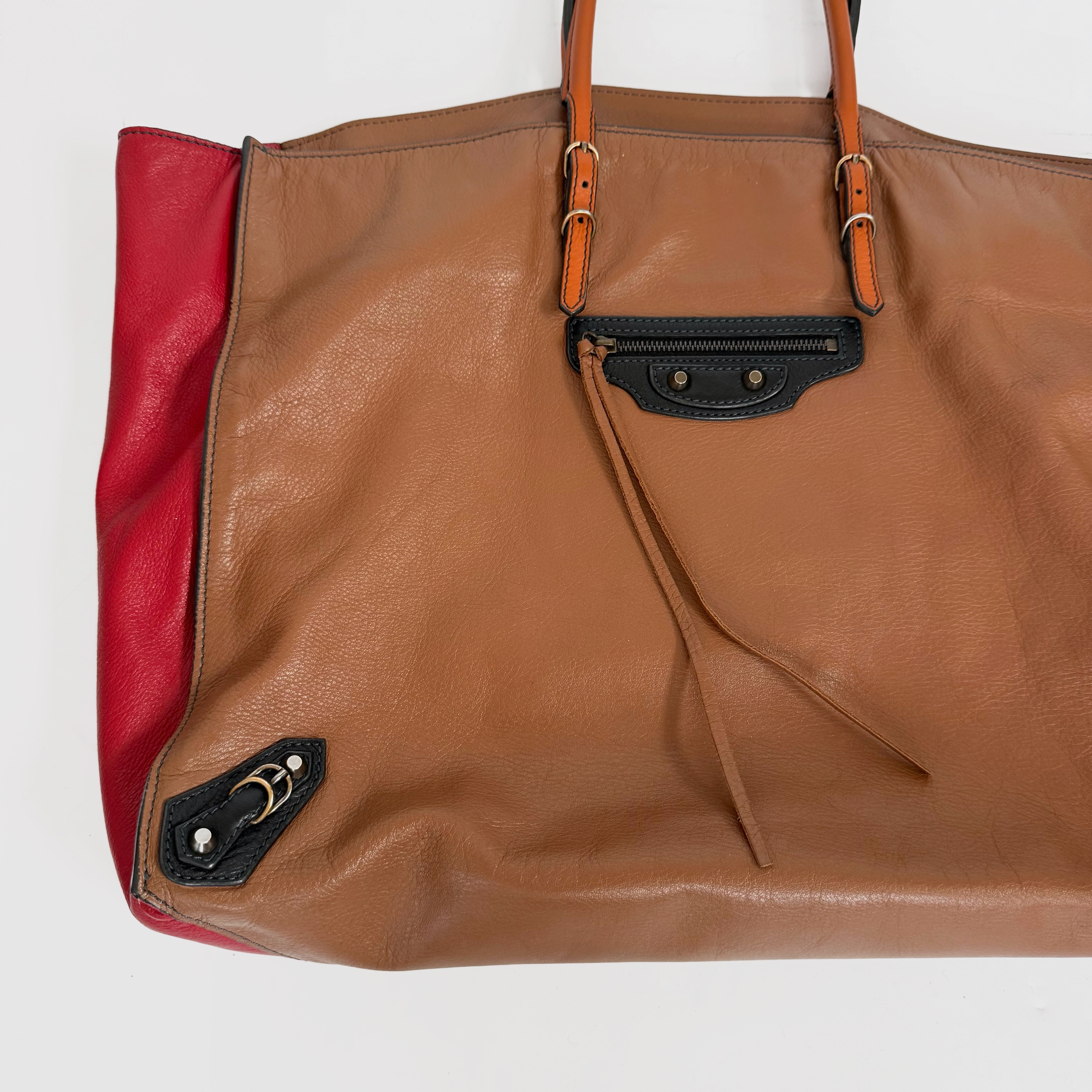 rare tan/red/black colourway — obsessed with the vibrant and striking shades! very soft leather, iconic balenciaga details and furniture, small signature pocket in front and another one inside. overall very spacious and perfect for travel or work