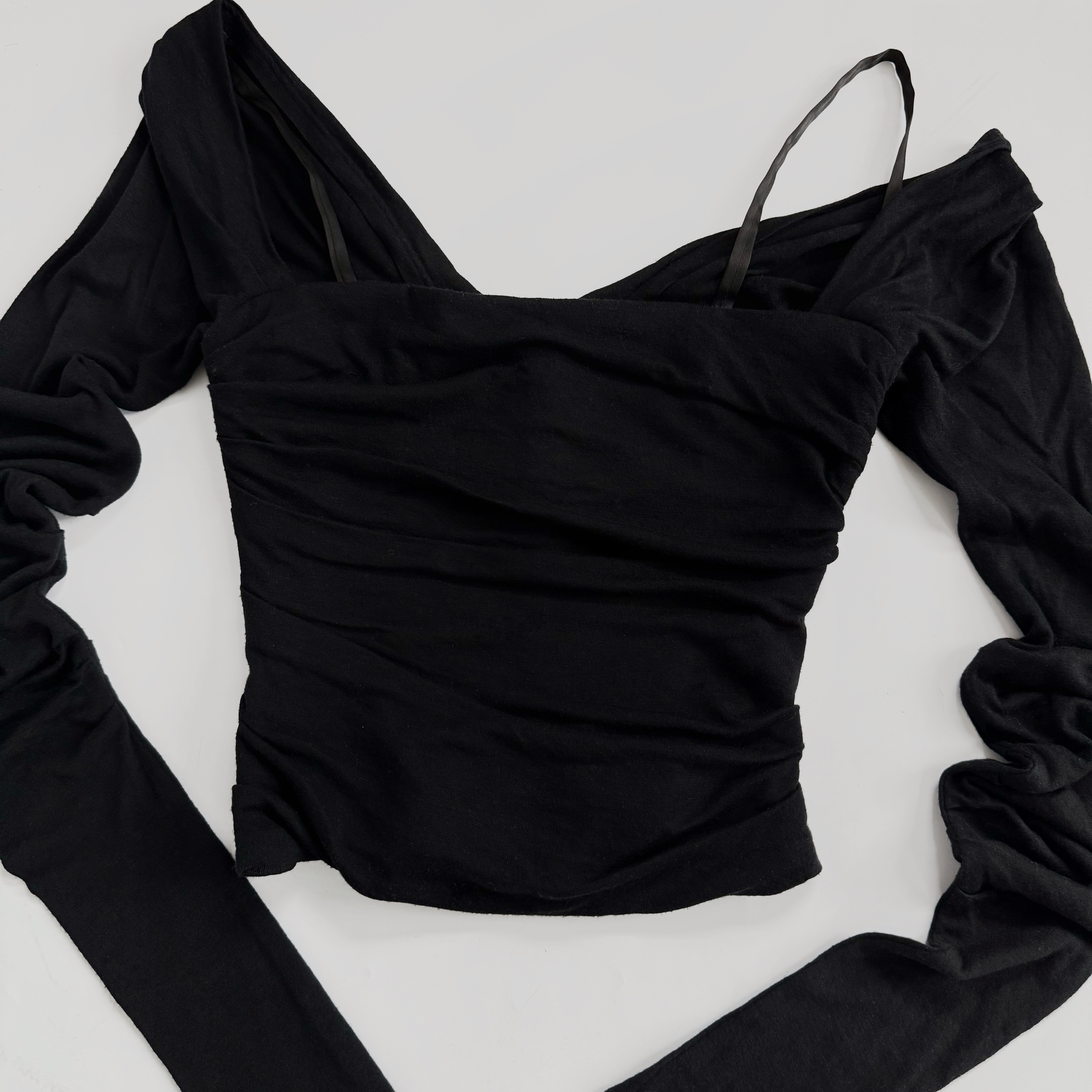the most gorgeous black long sleeve corset top with draping on the corset part and such elegant prolonged sleeves. branded heavy metallic zipper on the back. made to be worn one shoulder off. very soft, understated and chic