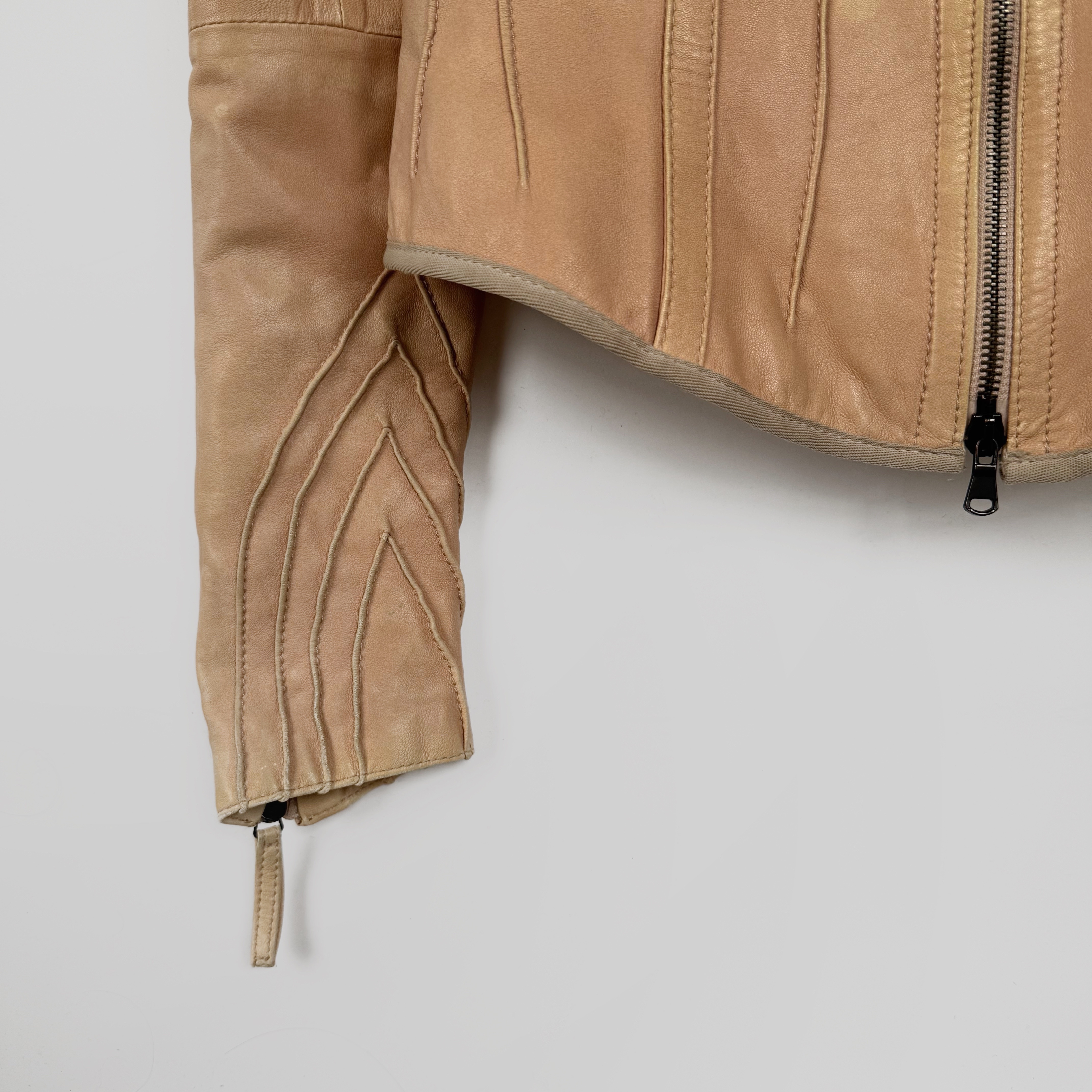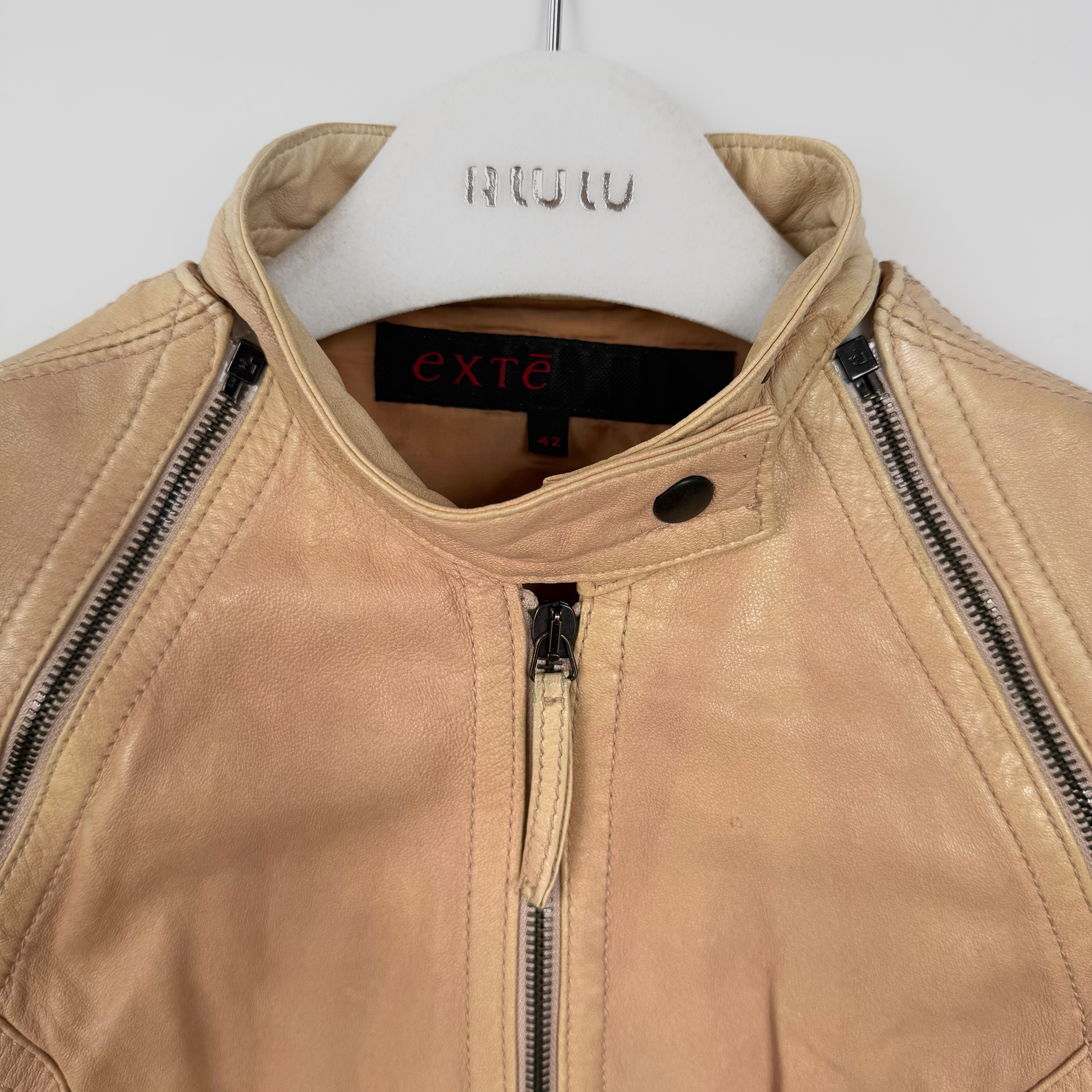 the most beautiful faded baby pink colour biker jacket with multiple zippers in front and the back which allow to play with the shape incredible details and fit slightly cropped and fitted around the waist minor signs of wear