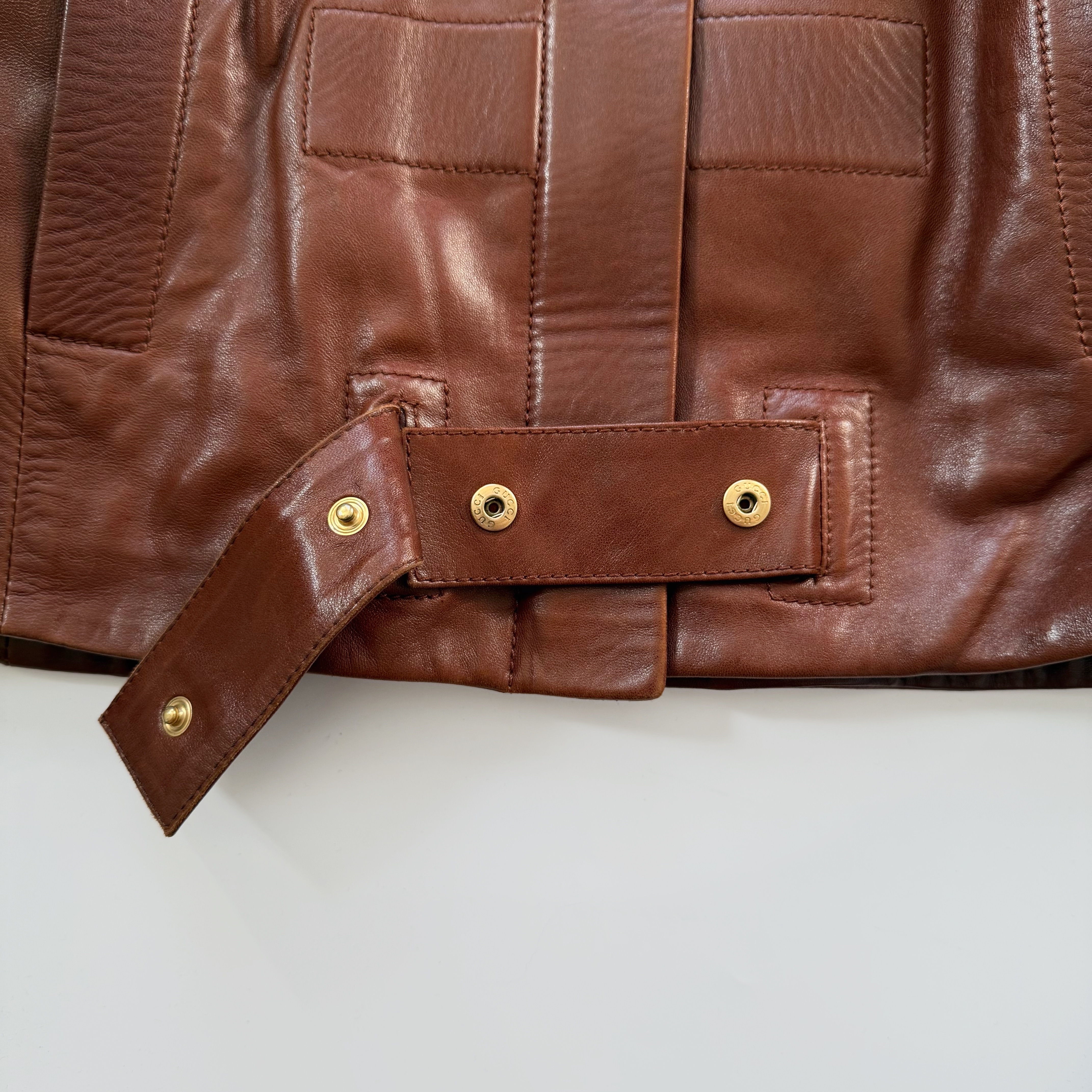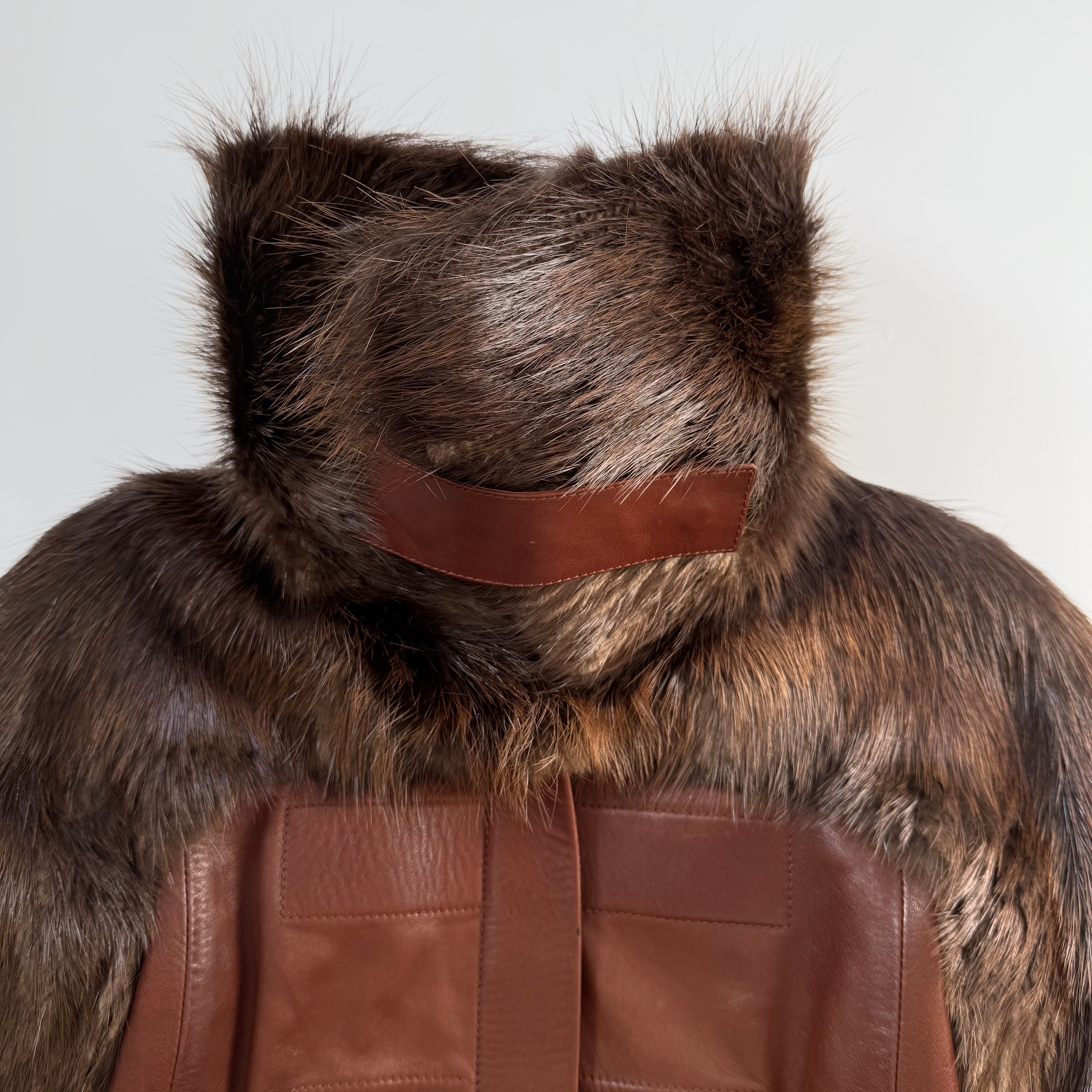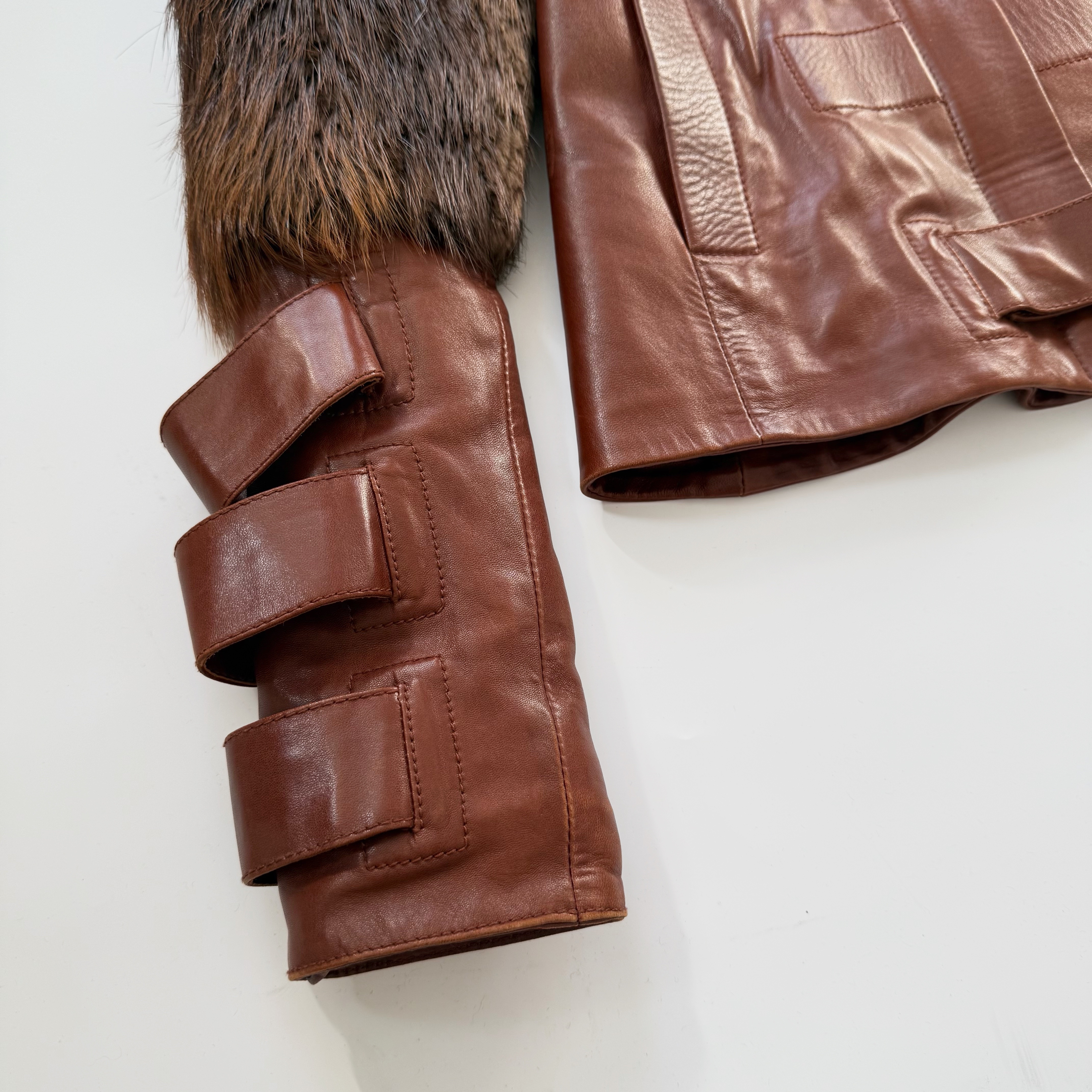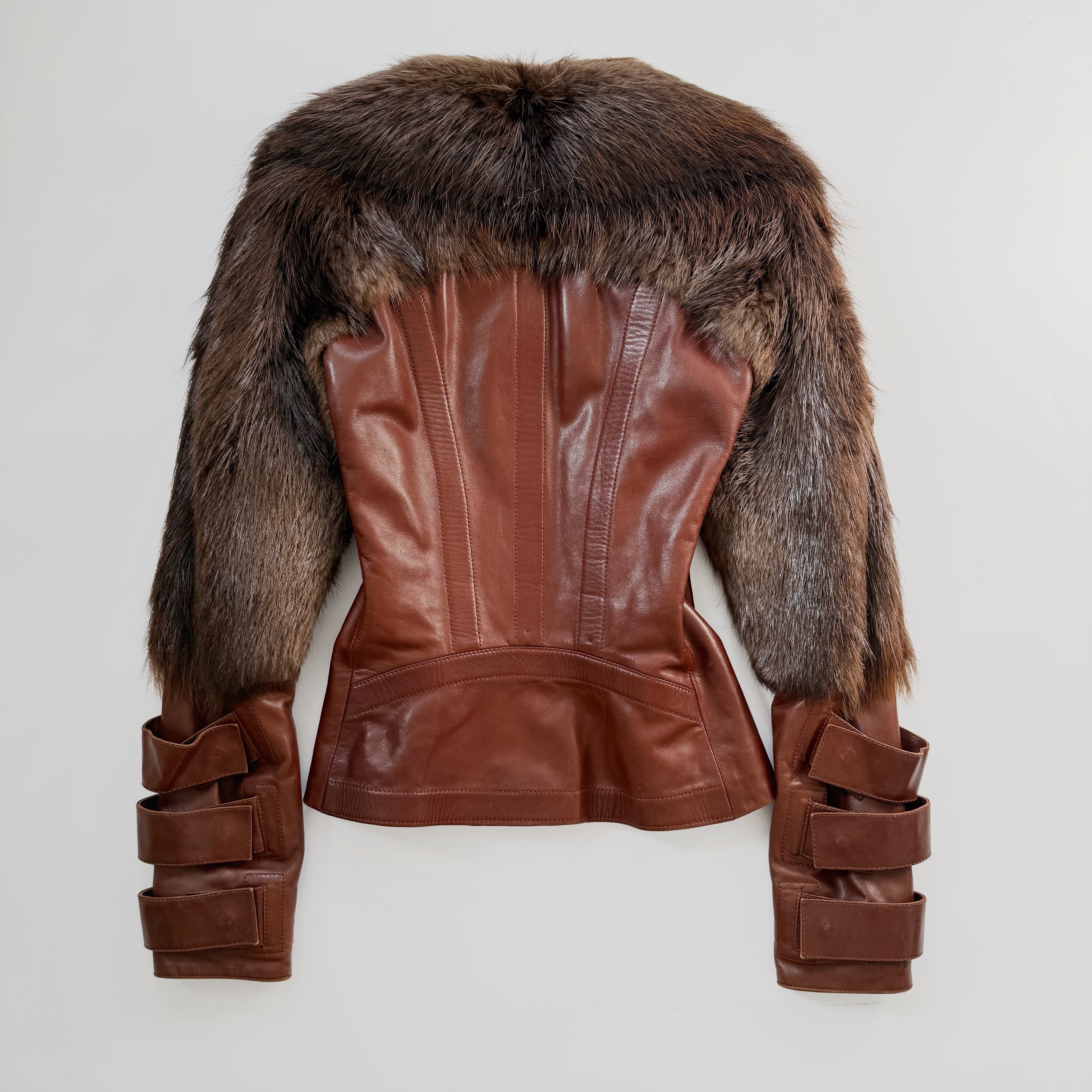 one of the most incredible items of my collection, softest brick red leather with beaver fur collar and rabbit inner lining, it's hard to describe how perfectly it's designed and tailored, two pockets in front, leather details on the sleeves, branded golden furniture, tom ford era