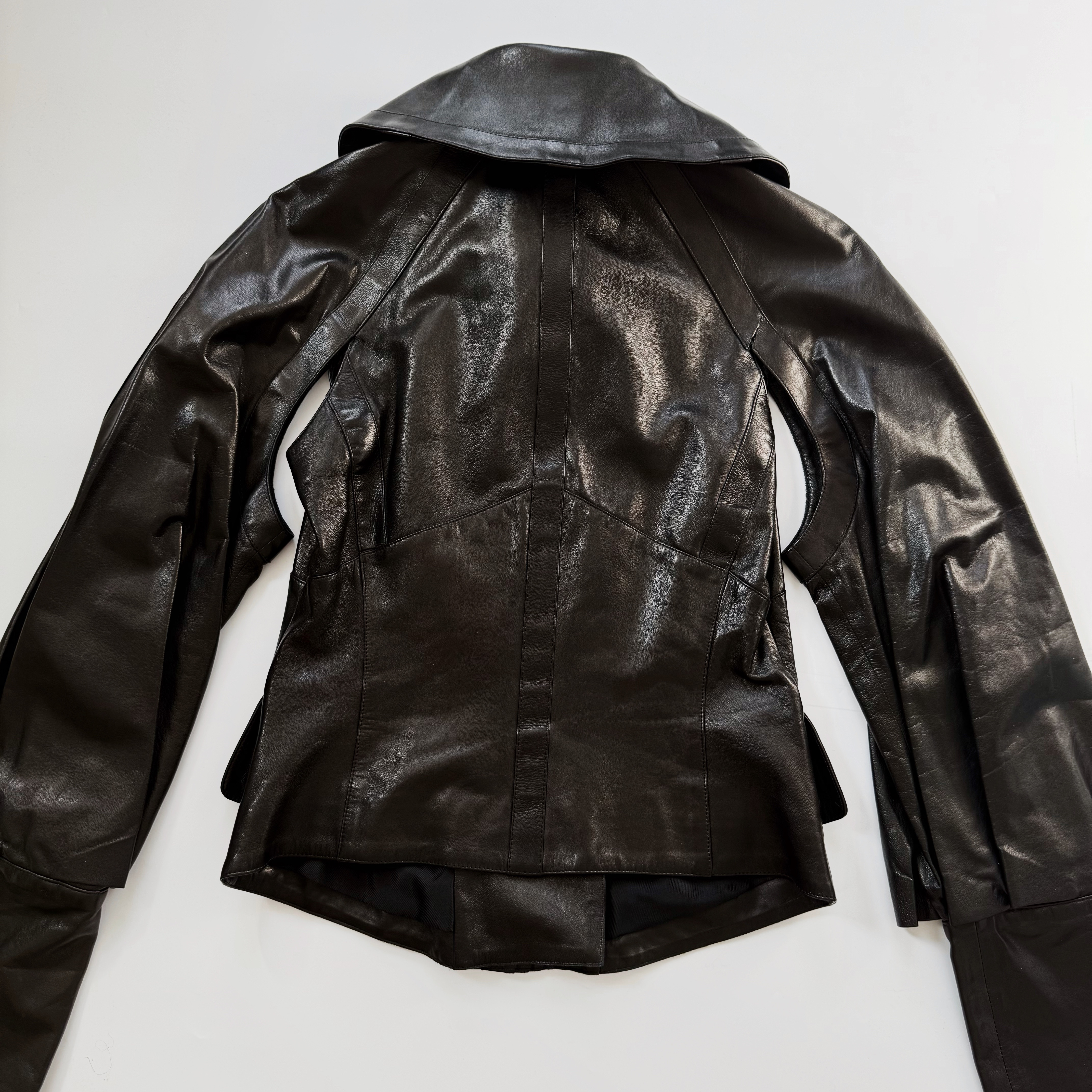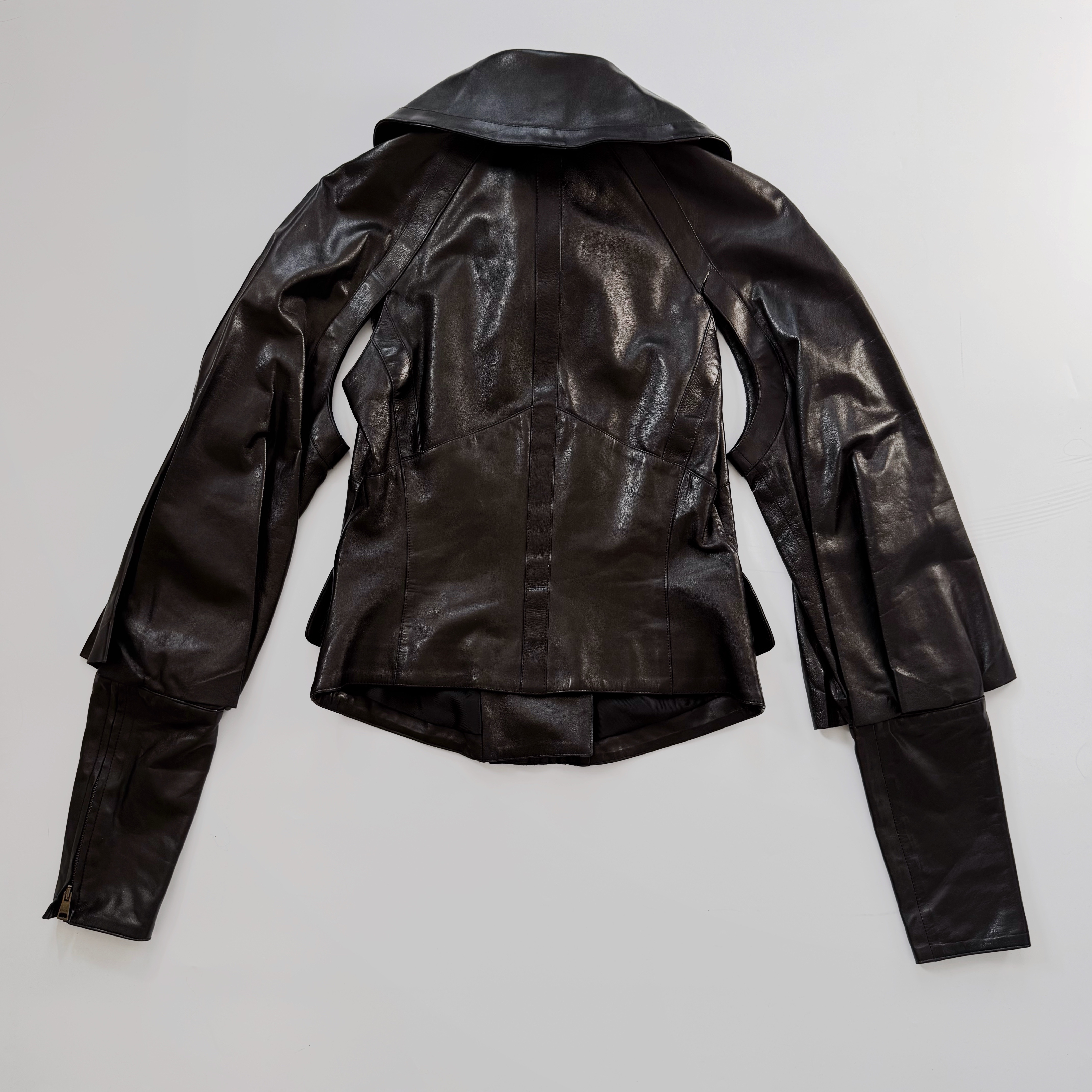 softest black lamb leather jacket, Tom Ford's incredible tailoring, diagonal branded furniture zipper, two front pockets, boxy sleeves with cut-out on the armpits, the collar can be worn up and down, fitted around the waist making up a very sexy fit, biker back, masterpiece (please note there is a tiny rip on one of the shoulders)