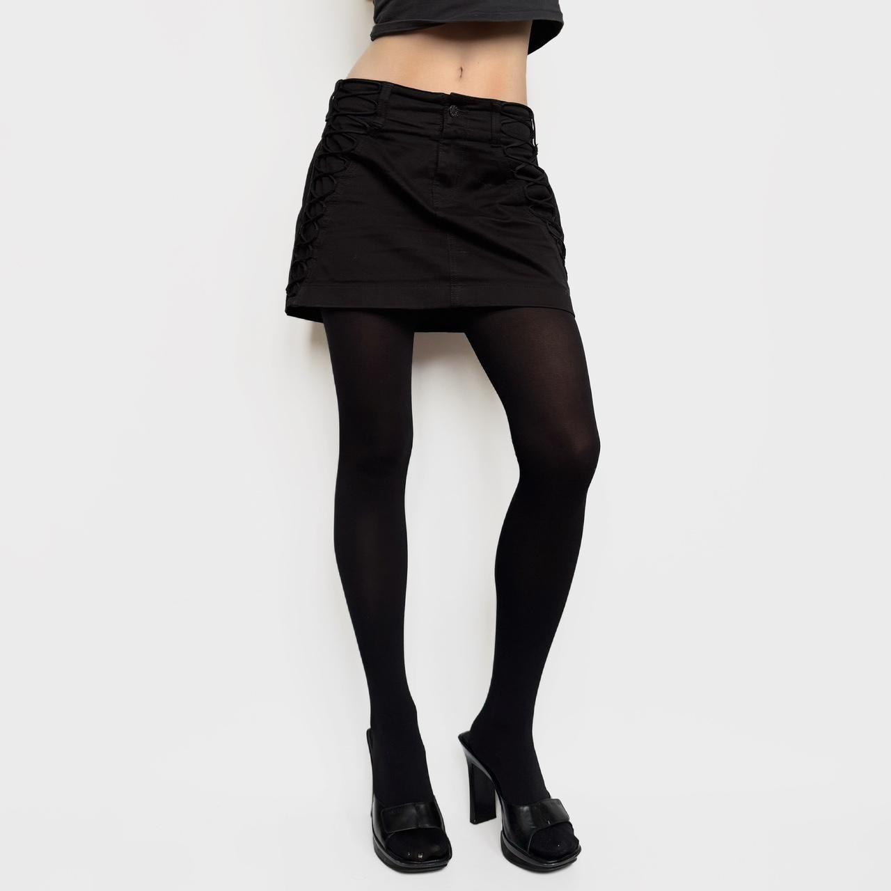 archive mini skirt from s/s 2009 line. black denim & corset type elements aside. gucci rubber patch on the back pocket