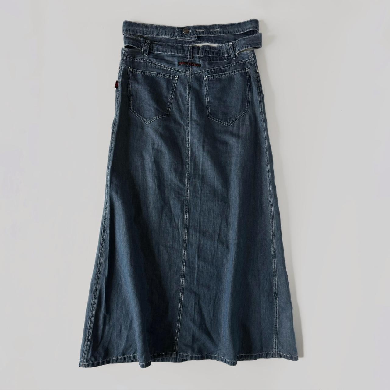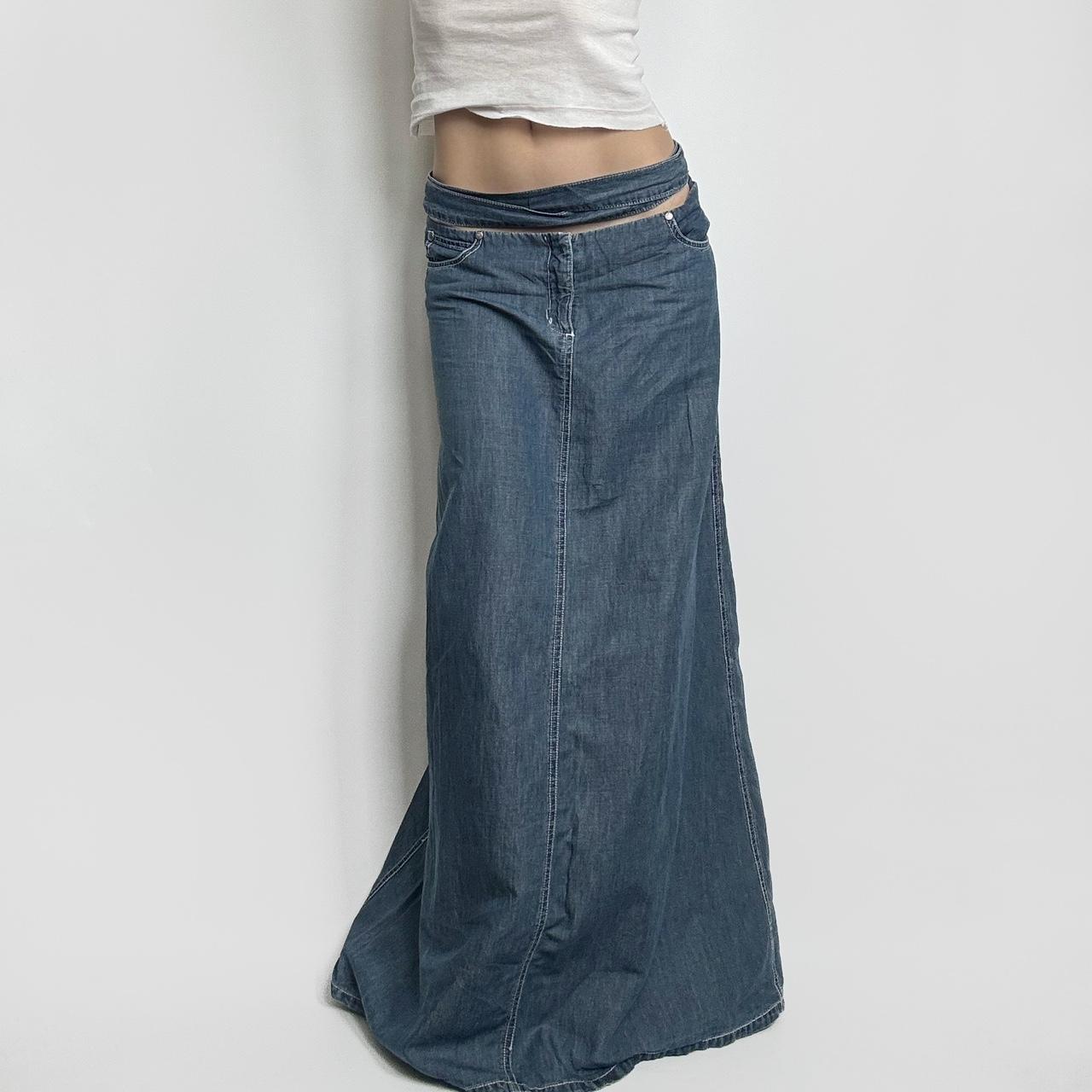 jean paul gaultier denim maxi skirt in navy denim material, extremely low rise & belt elements. p.s. we have the matching top from the same line - check our store!
