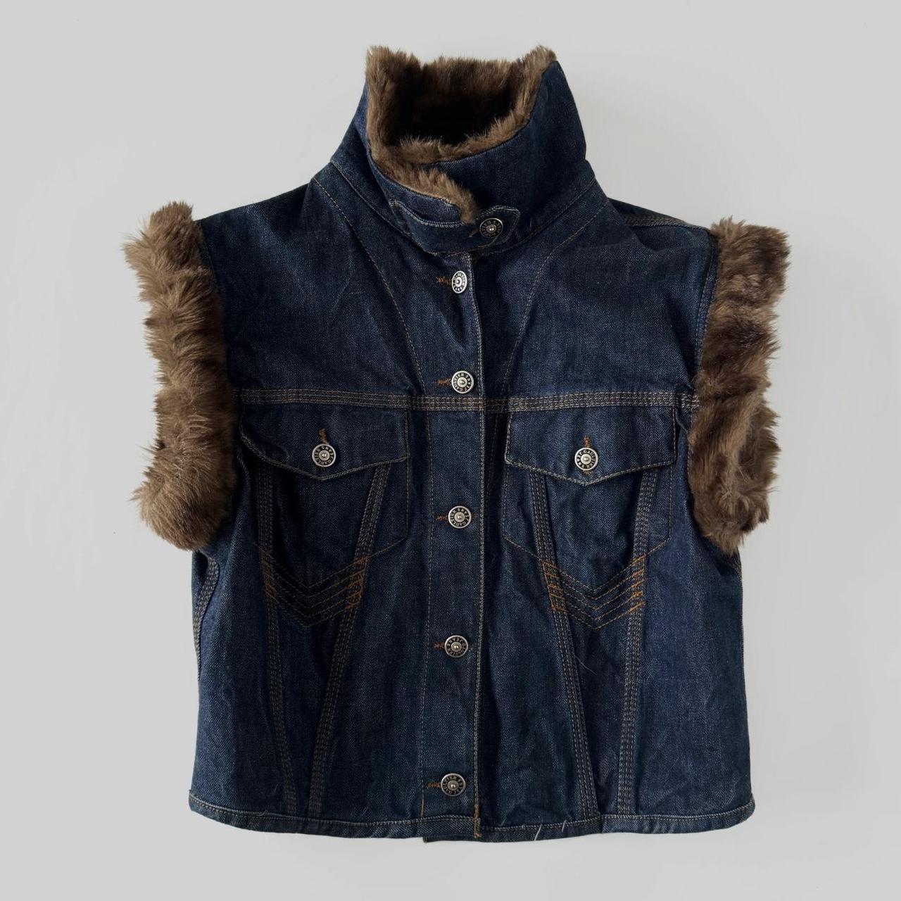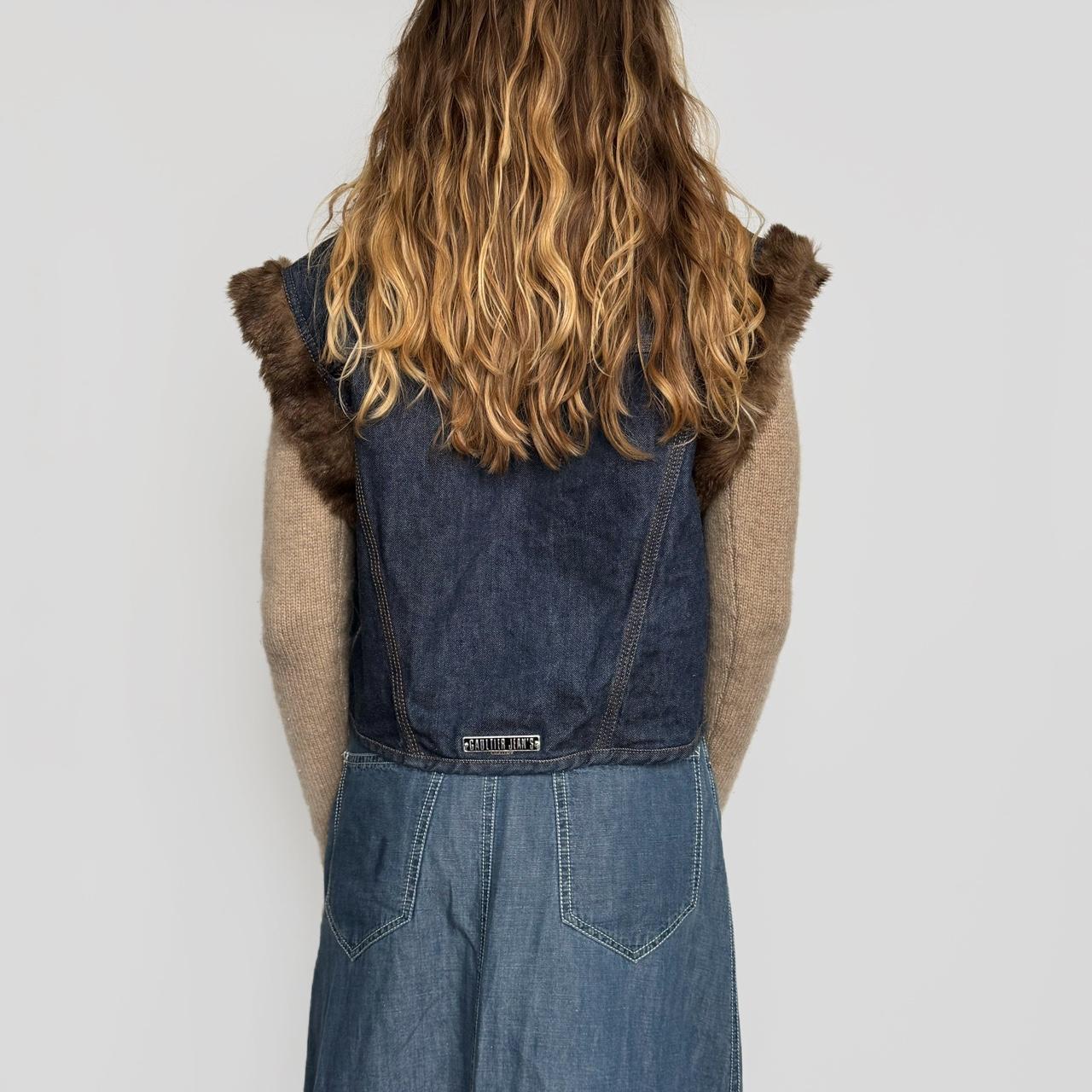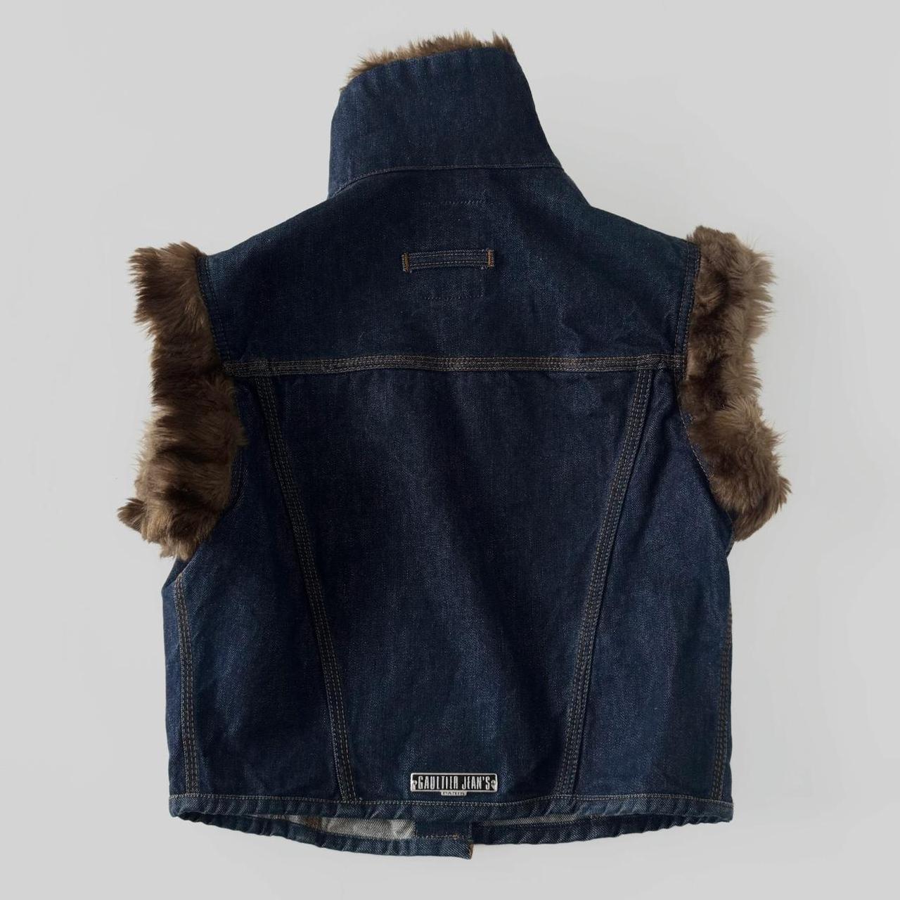 jean paul gaultier archive 90s vest. navy denim material and brown faux fur on the sleeves and collar