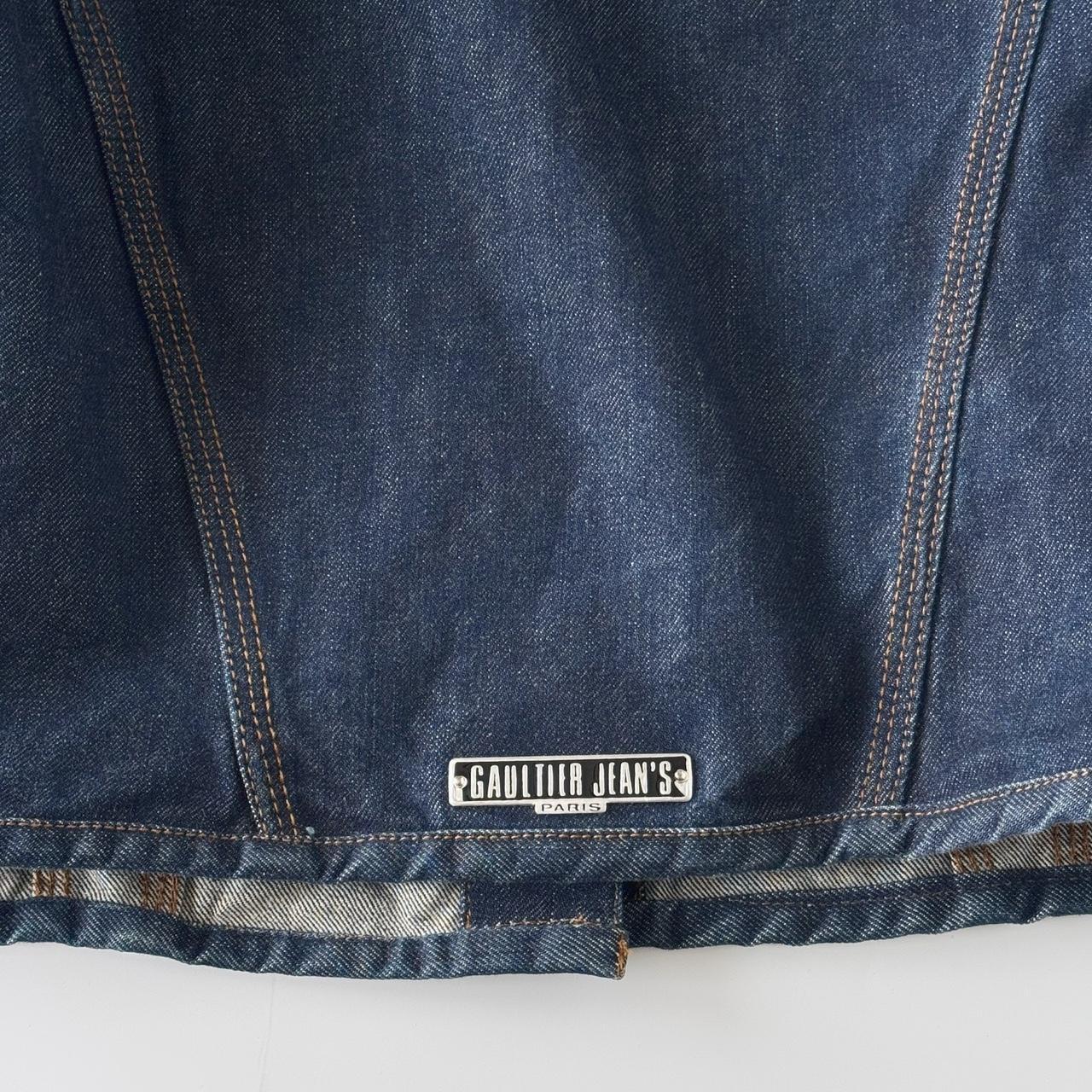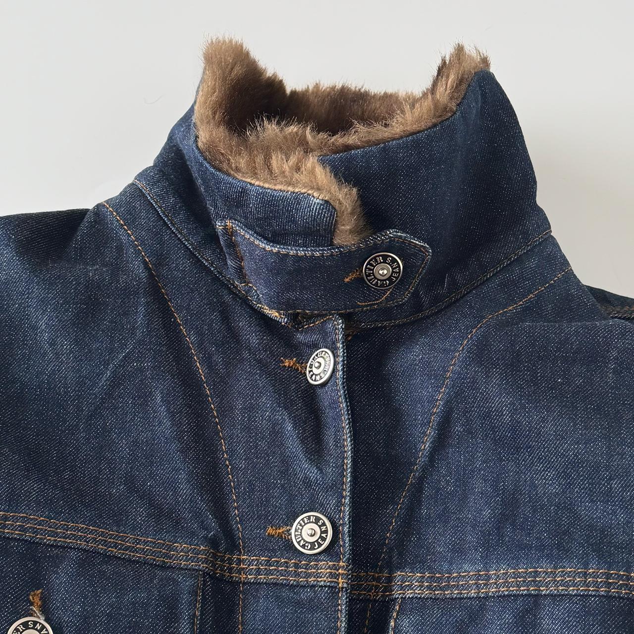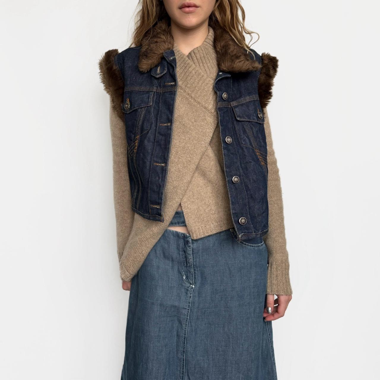 jean paul gaultier archive 90s vest. navy denim material and brown faux fur on the sleeves and collar