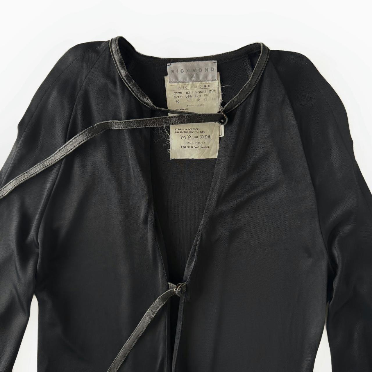 2 leather straps infront and cut outs on both sleeves. black viscose material