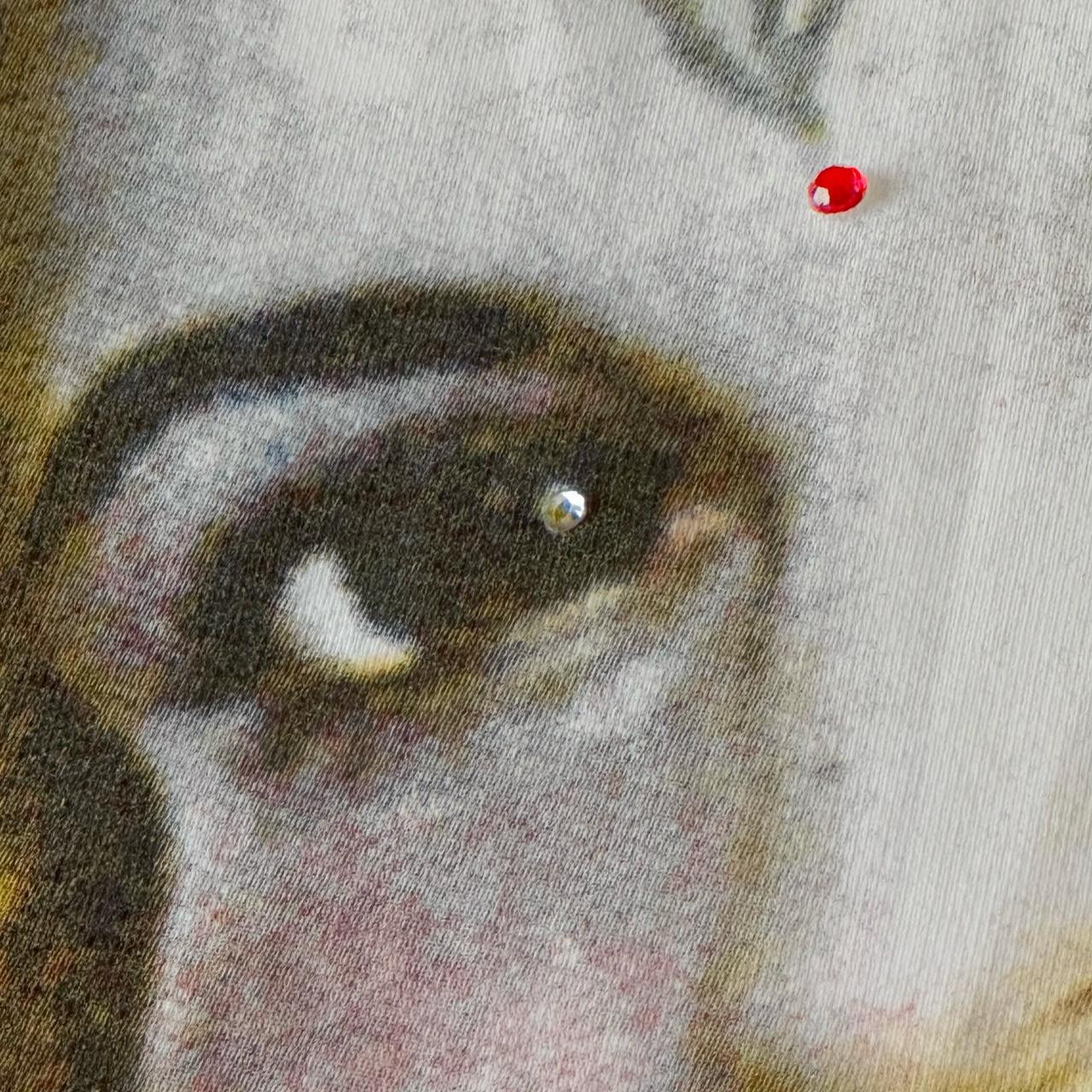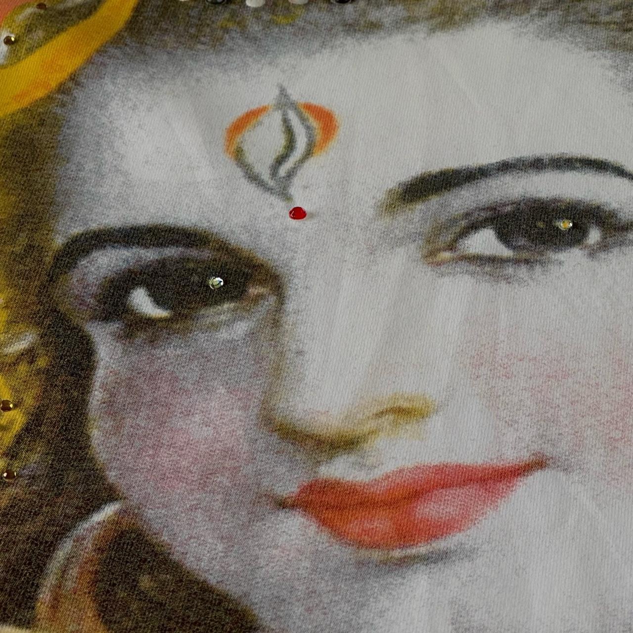 moschino jeans line. vintage tank top with religious print and rhinestones infront.