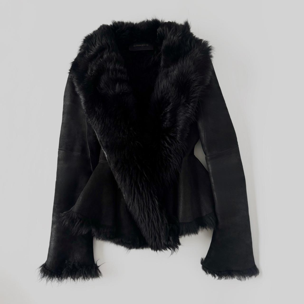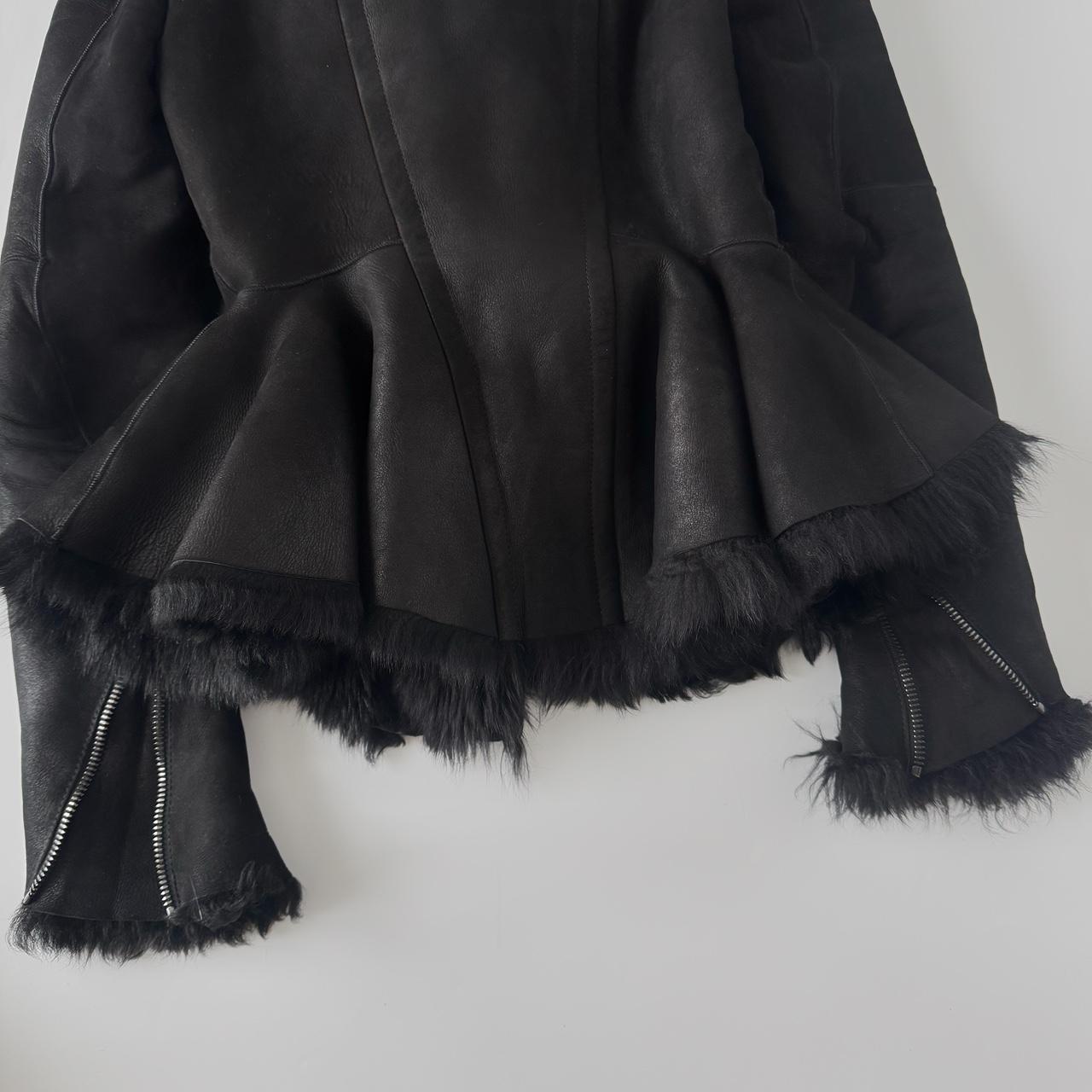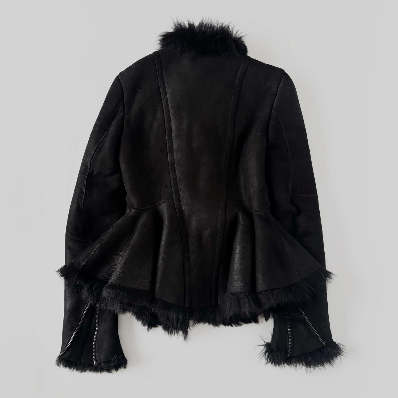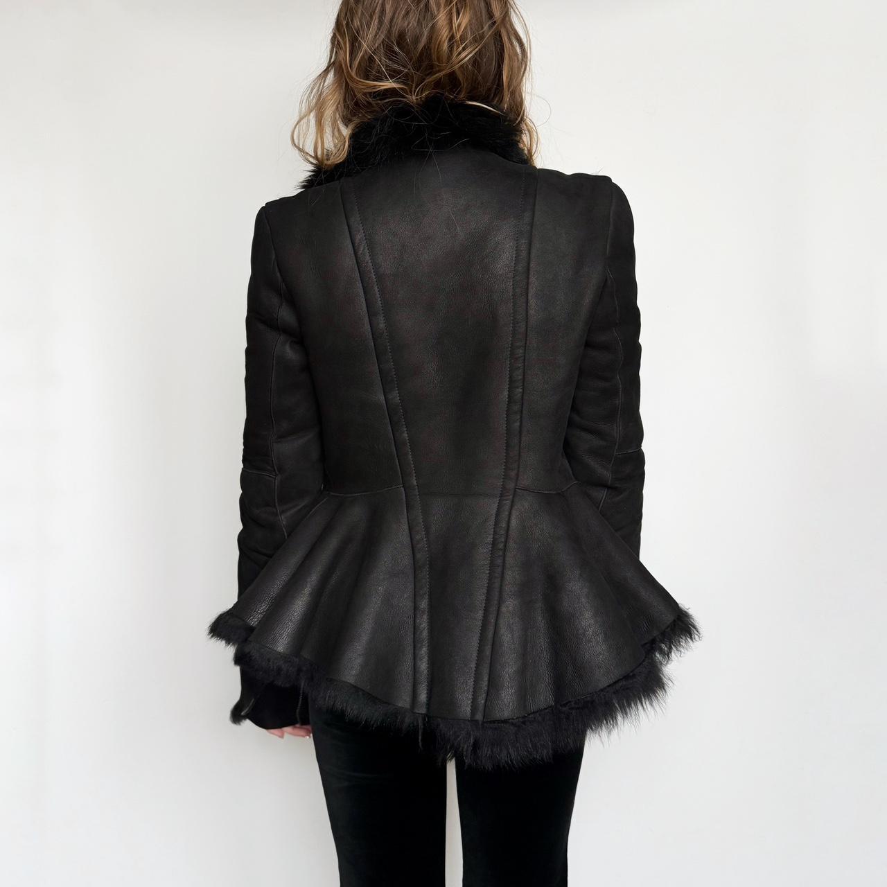 archive fur / shearling coat in black colour. beautiful feminine silhouette with flared sleeves and tailored waist, which reminds me of old mugler. genuine fur & leather, extremely warm piece