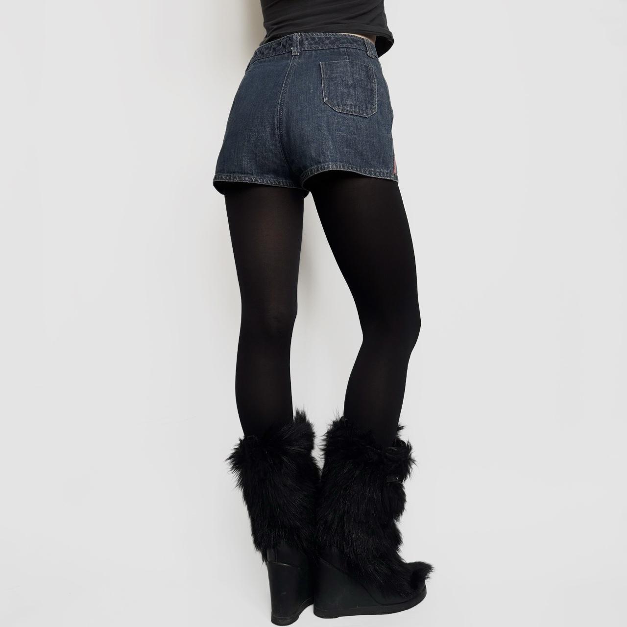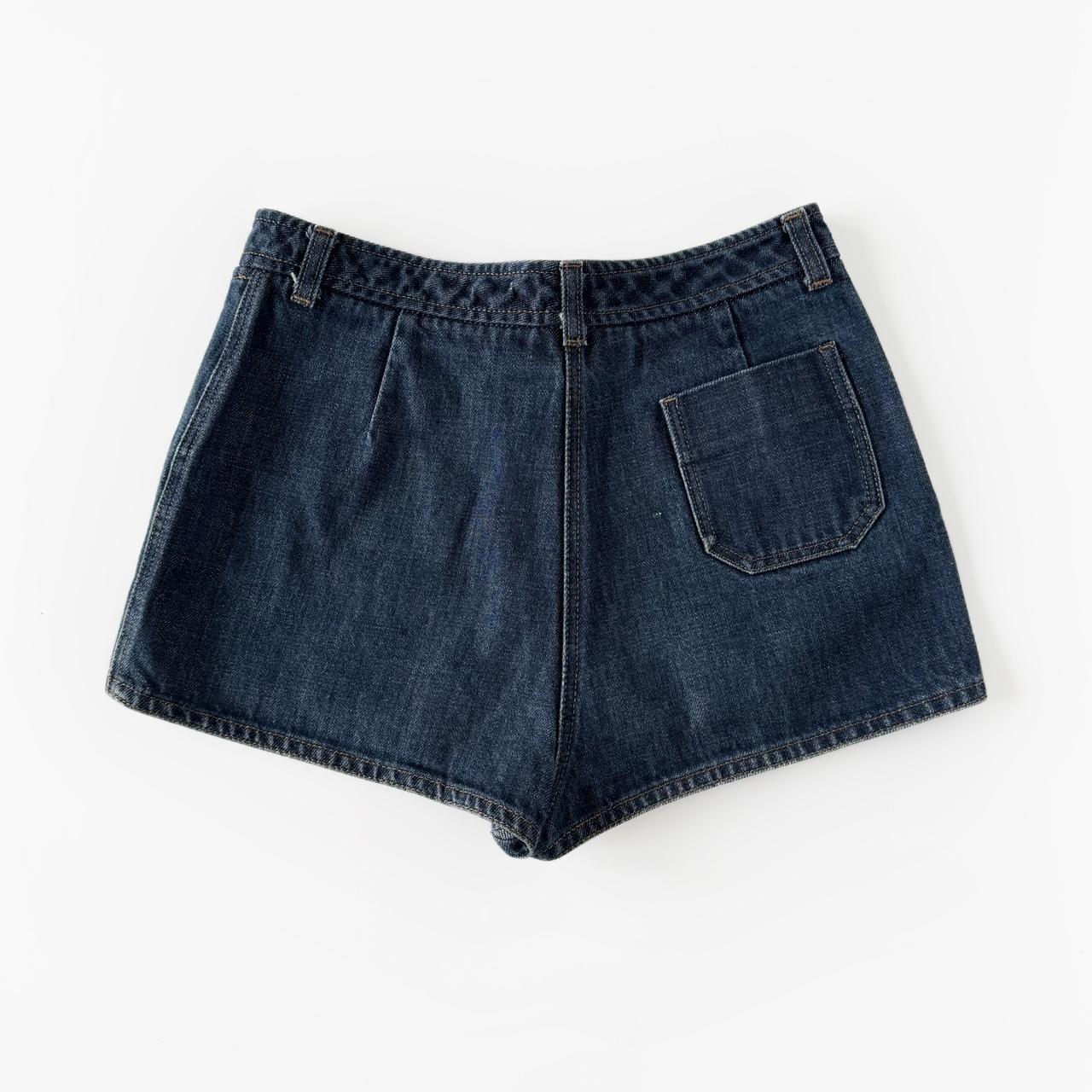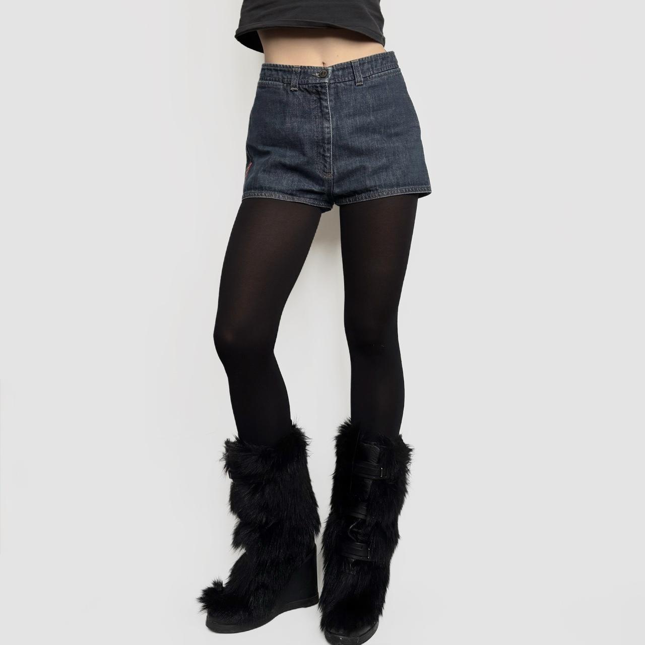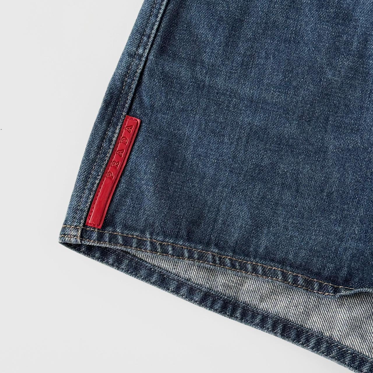 archive mini shorts, navy denim material and rubber prada logo red strip aside