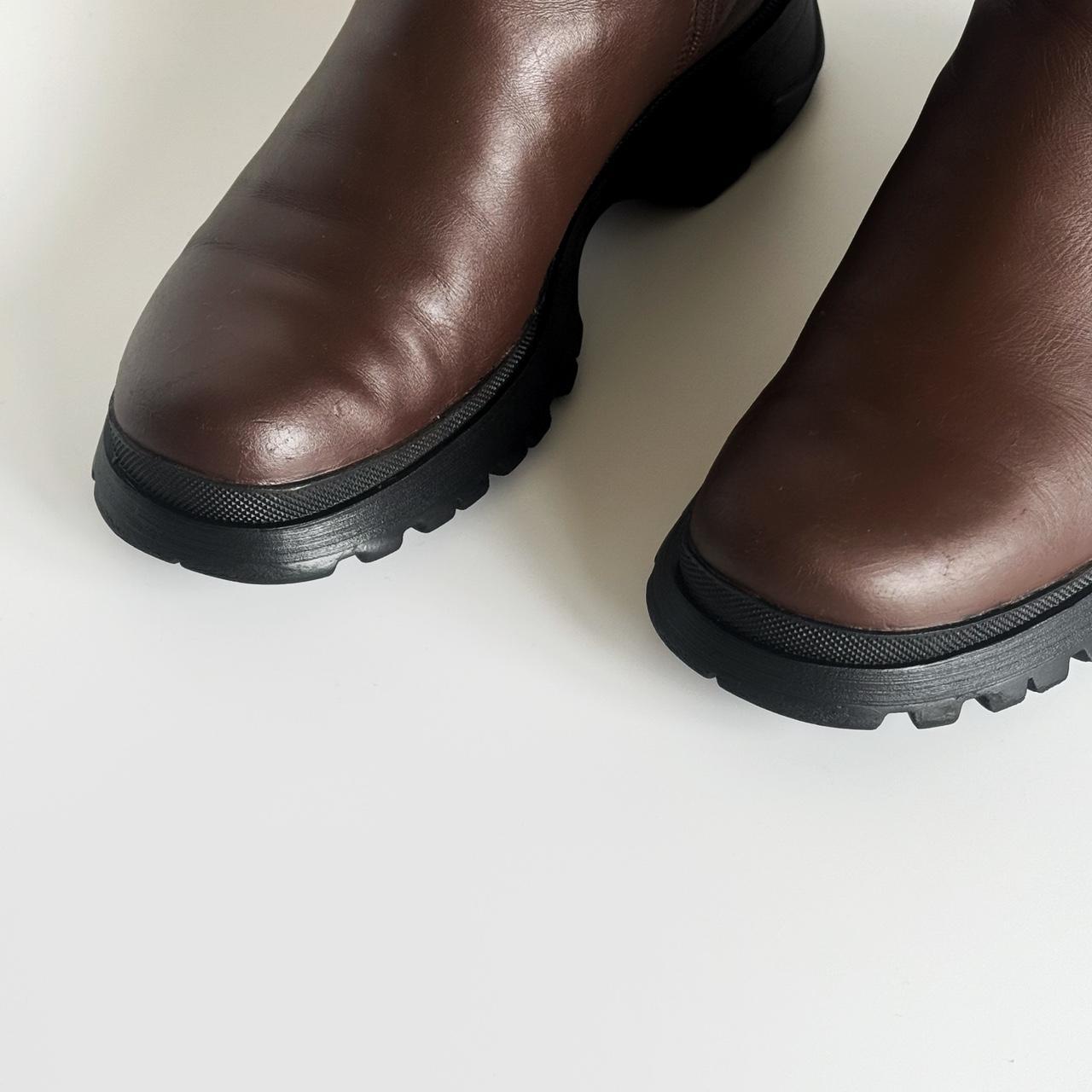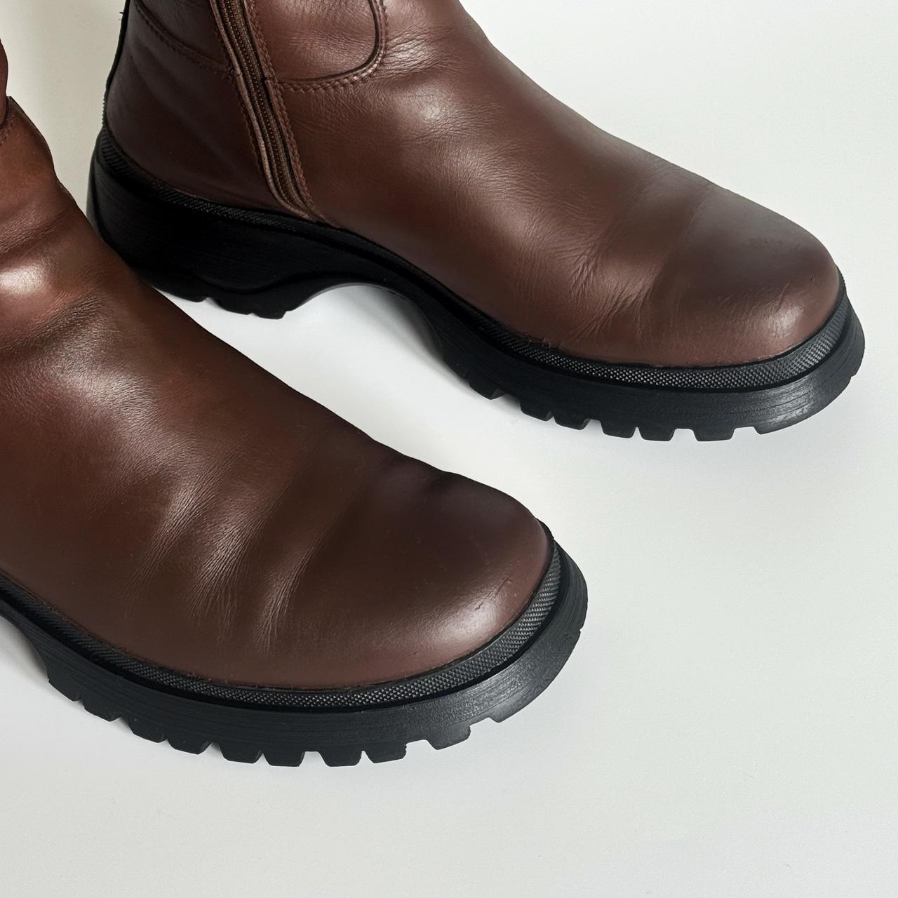 brown leather boots with black rubber lug soles and zippers aside