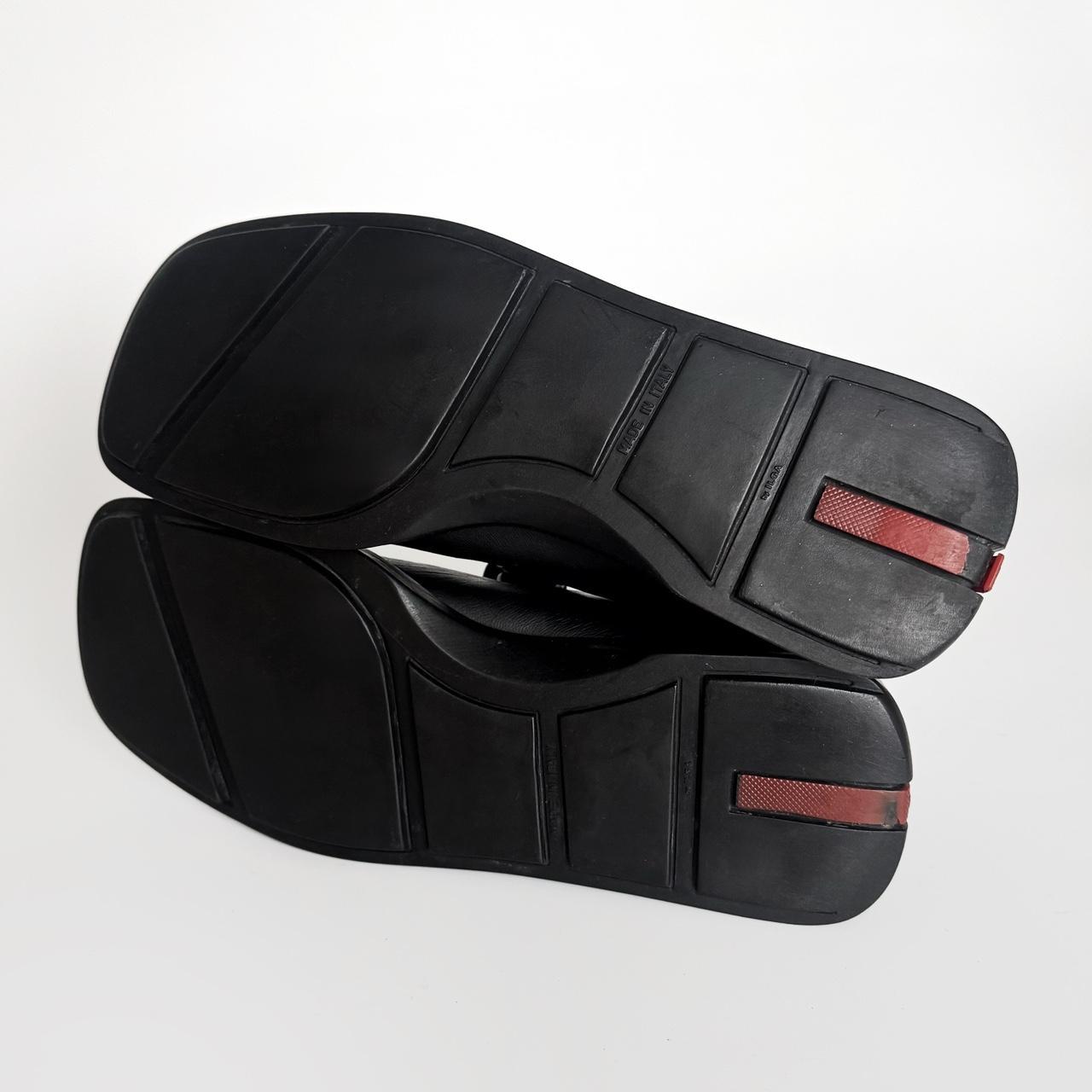 softest black leather courts, neoprene lining and rubber soles with prada logo red stripes. extremely comfortable to wear
