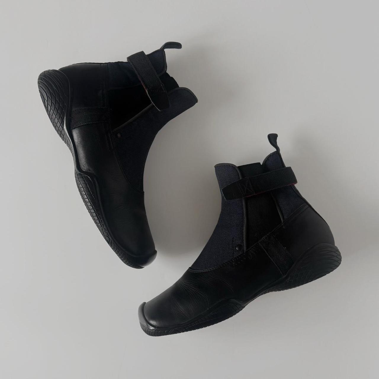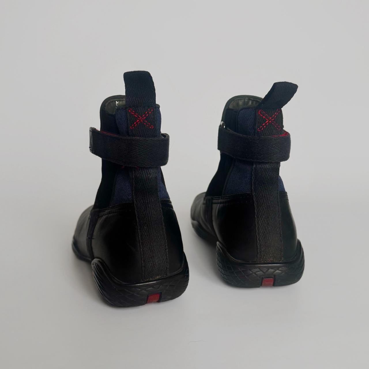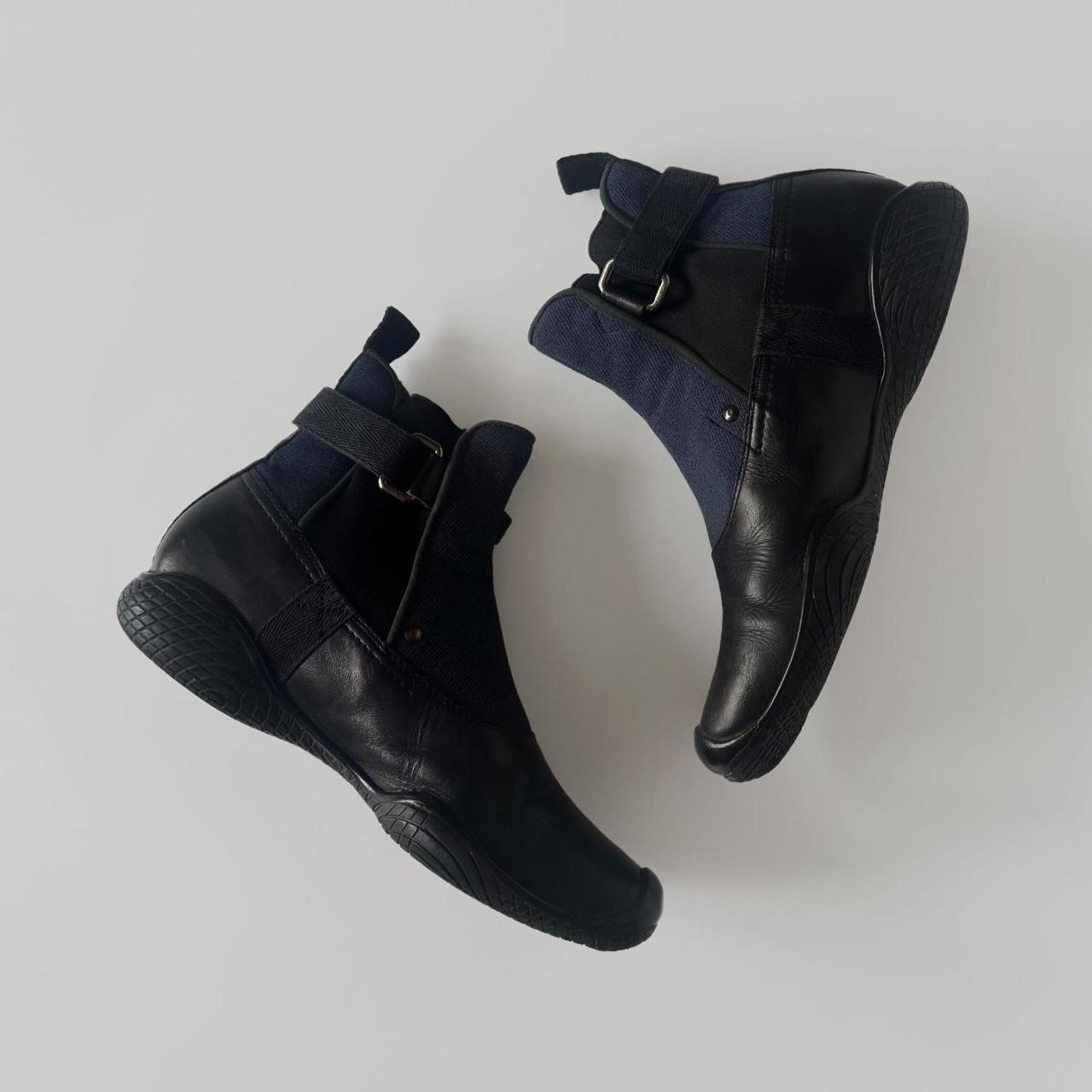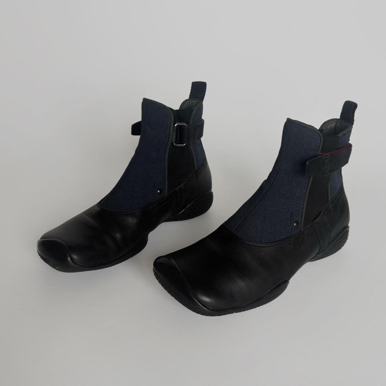 prada ankle boots from f/w 2000 line. black leather and navy waterproof denim, velcro straps aside. love the way they look like ballet flats and navy socks