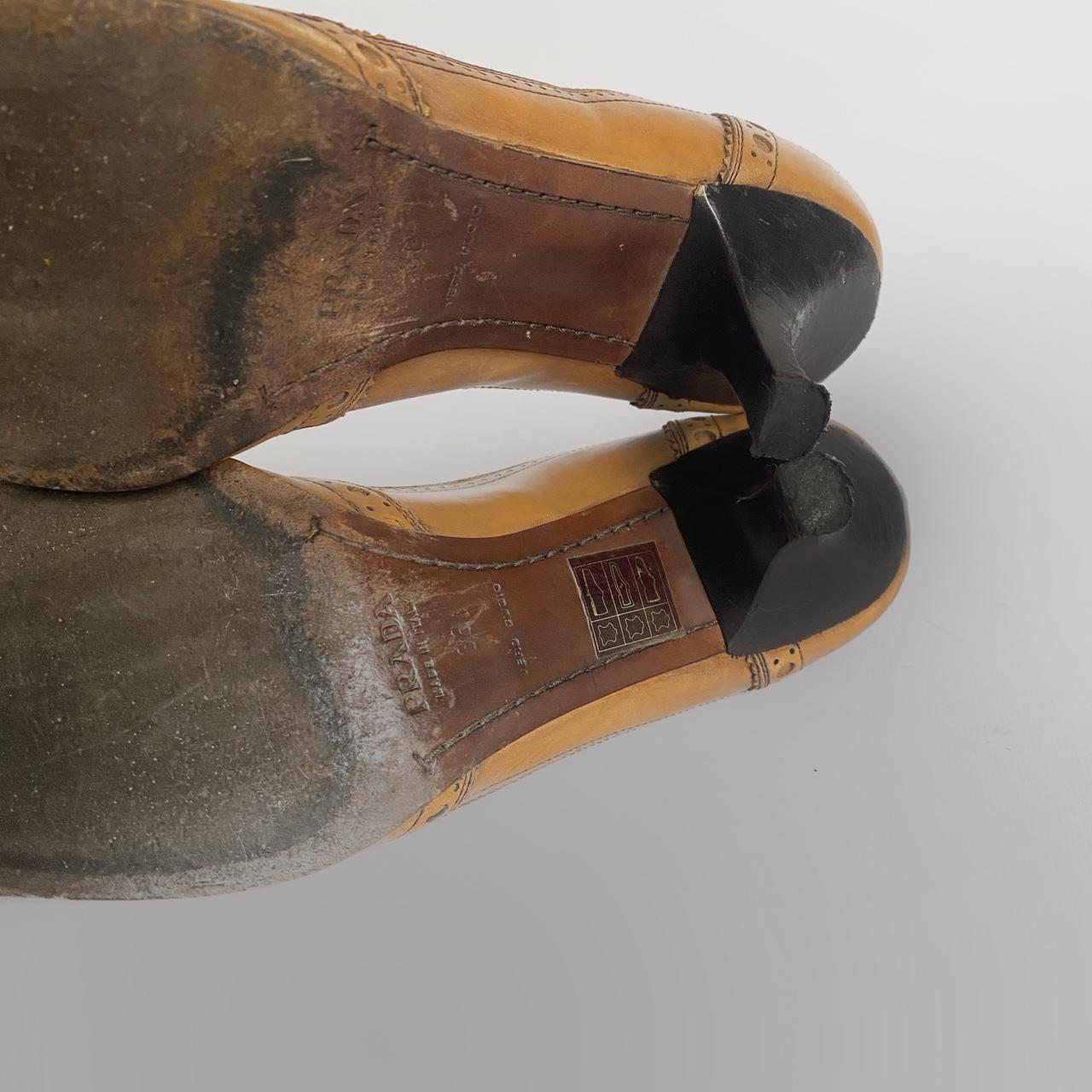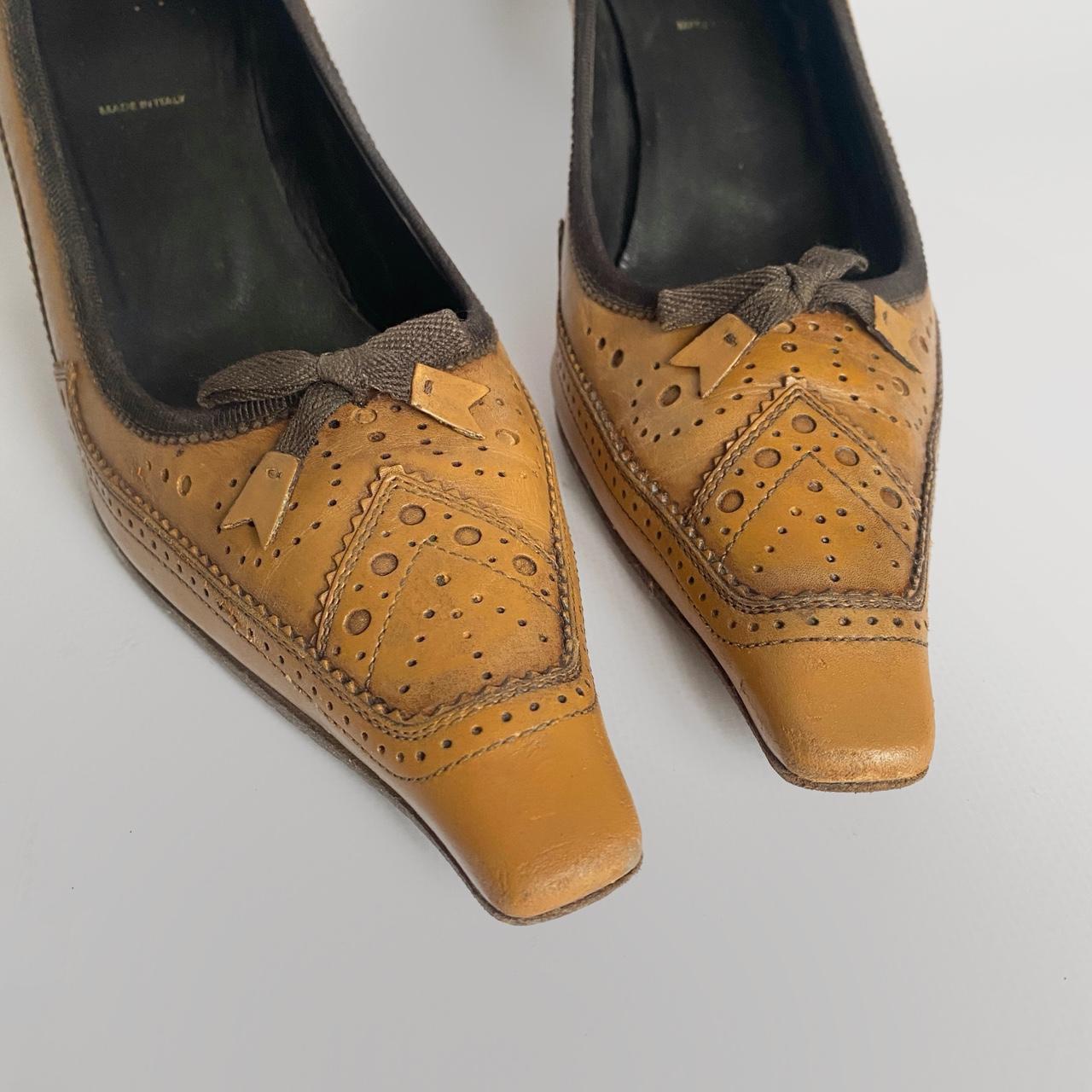prada 2003 vintage kitten heels with cutest bows on top. pale orange / light brown leather and brown elements