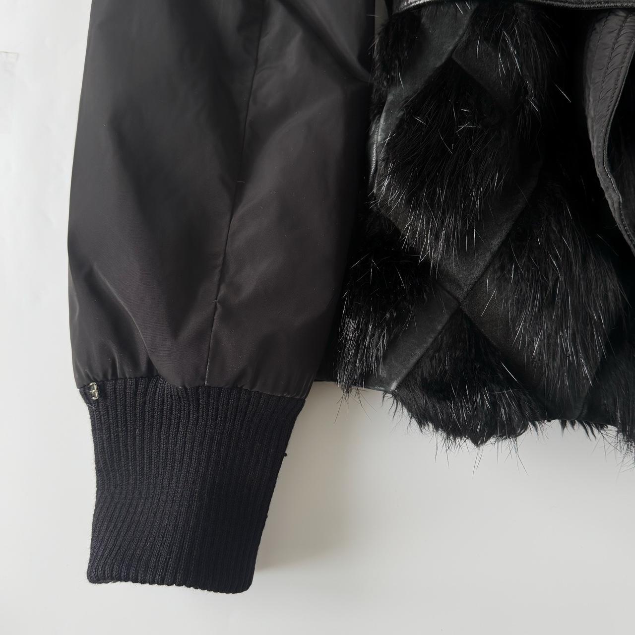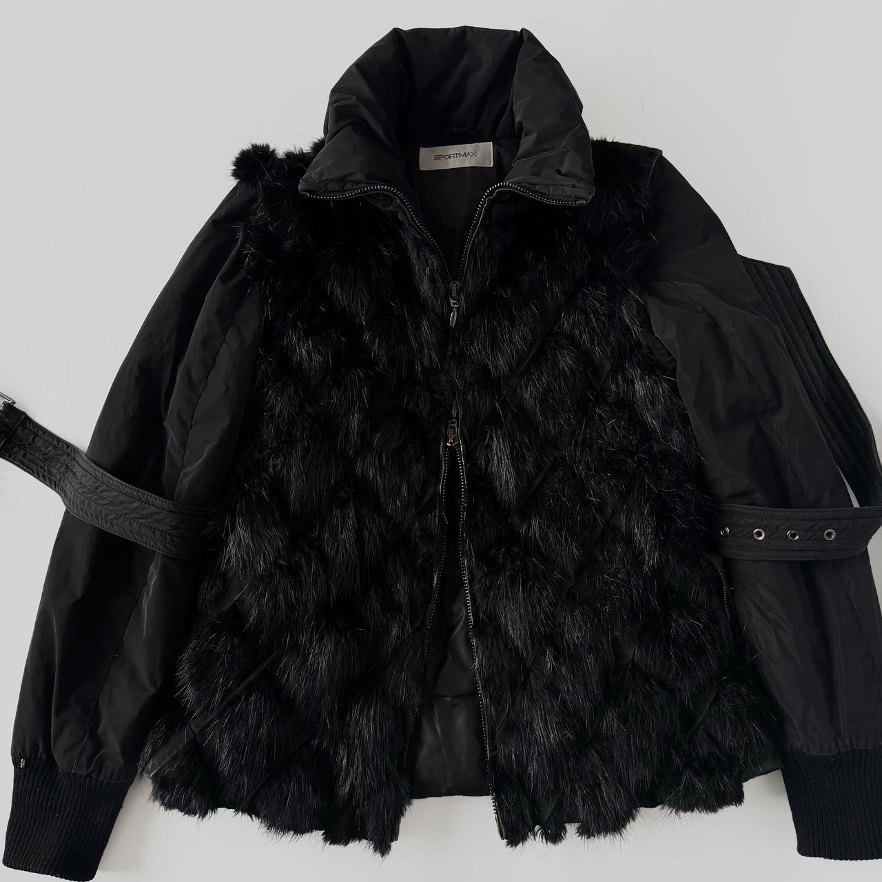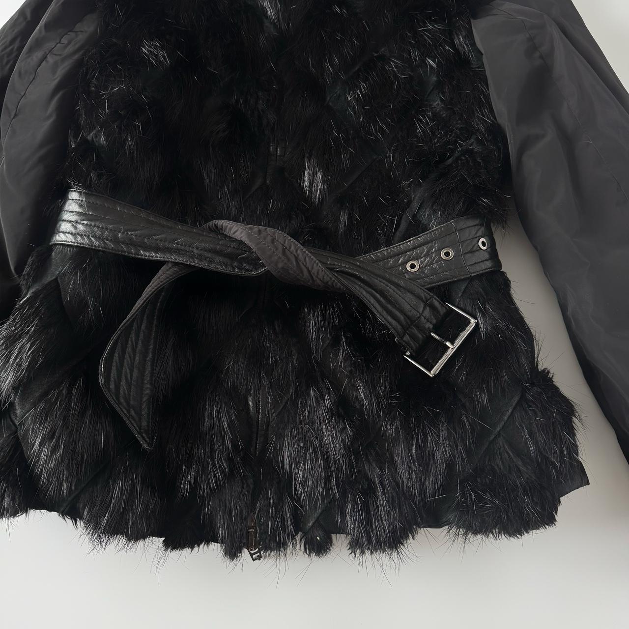 archive puffer jacket with genuine fur in black colour. fox fur, nylon and leather elements. sleeves can be unzipped and the piece can be turned into a fur vest